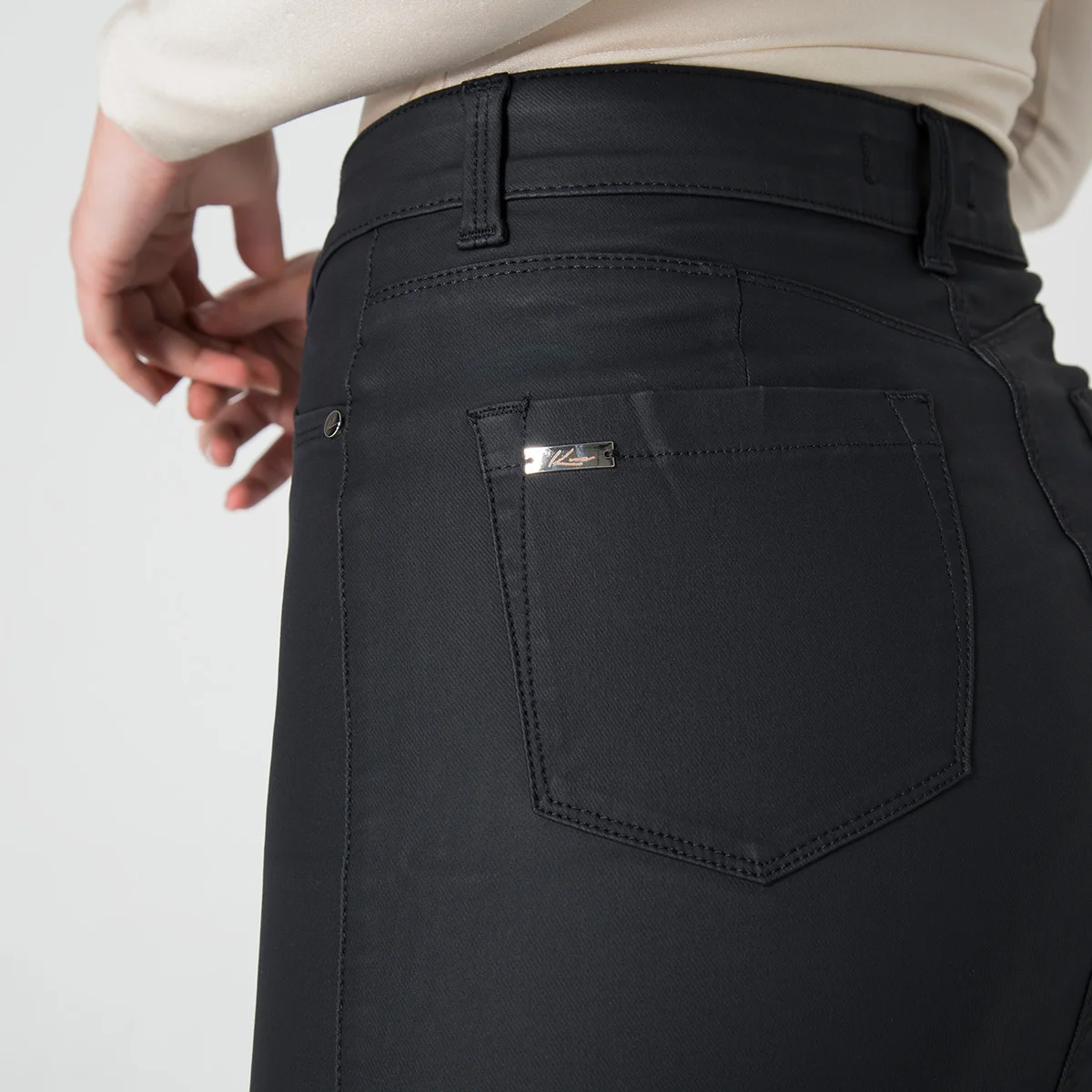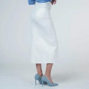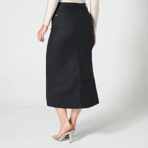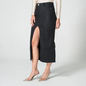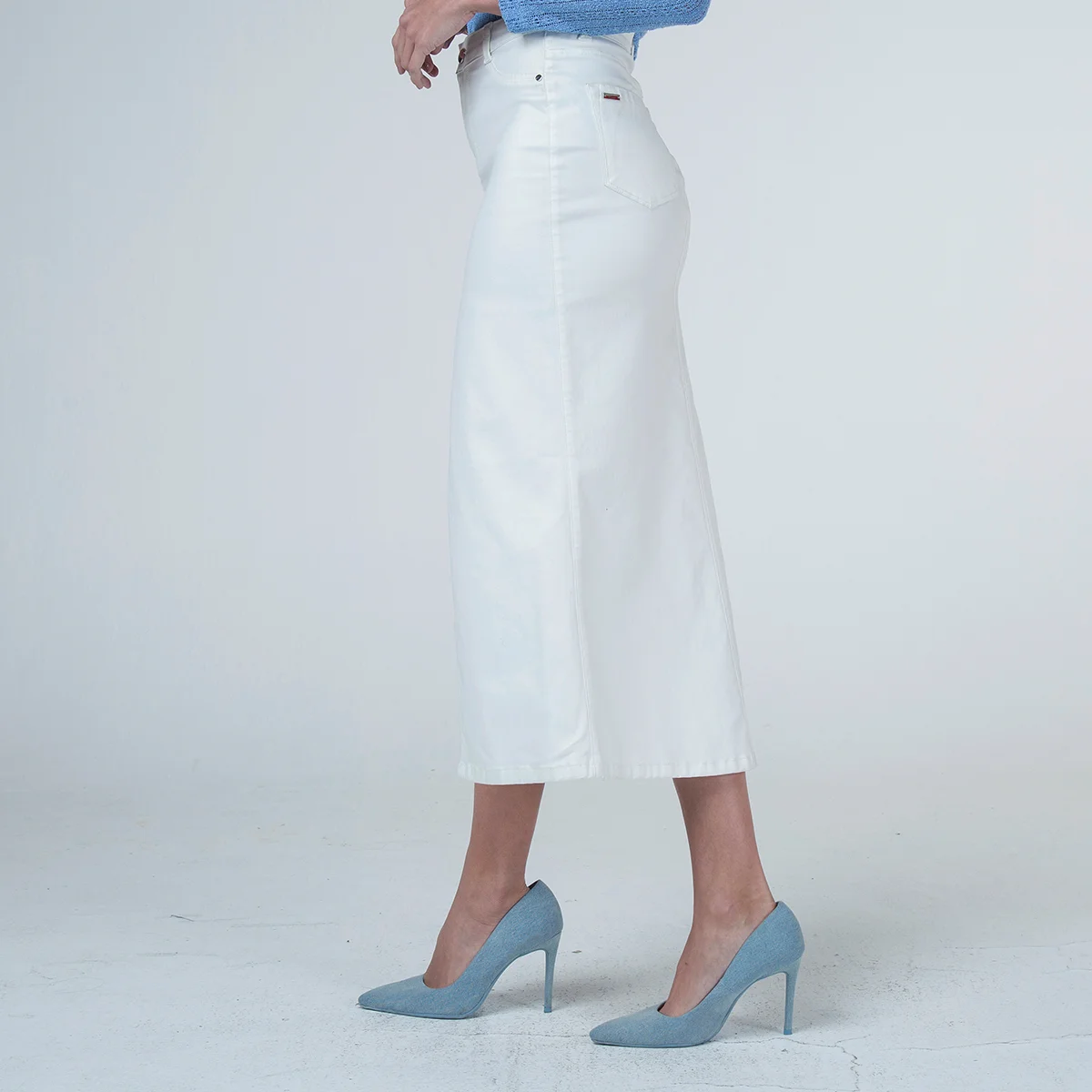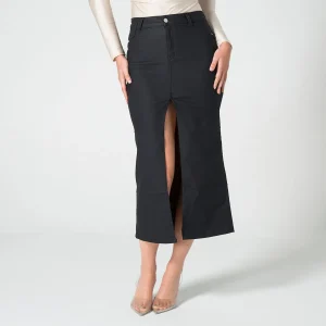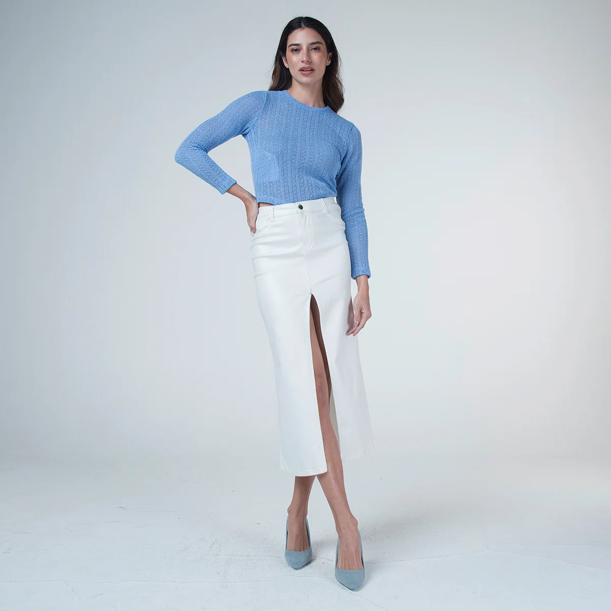 Falda Midi Start en denim resinado es una prenda moderna y versátil, ideal para crear looks tanto casuales como más arreglados. Su diseño incluye una pretina que se cierra con un solo botón y un práctico cierre de cremallera, lo que facilita su uso y ajuste. En la parte frontal, destaca por la imitación de un bolsillo redondo y relojero, que añade un toque de estilo y originalidad. En la parte posterior, la falda cuenta con bolsillos tipo parche, que no solo son funcionales, sino que también complementan su estética.