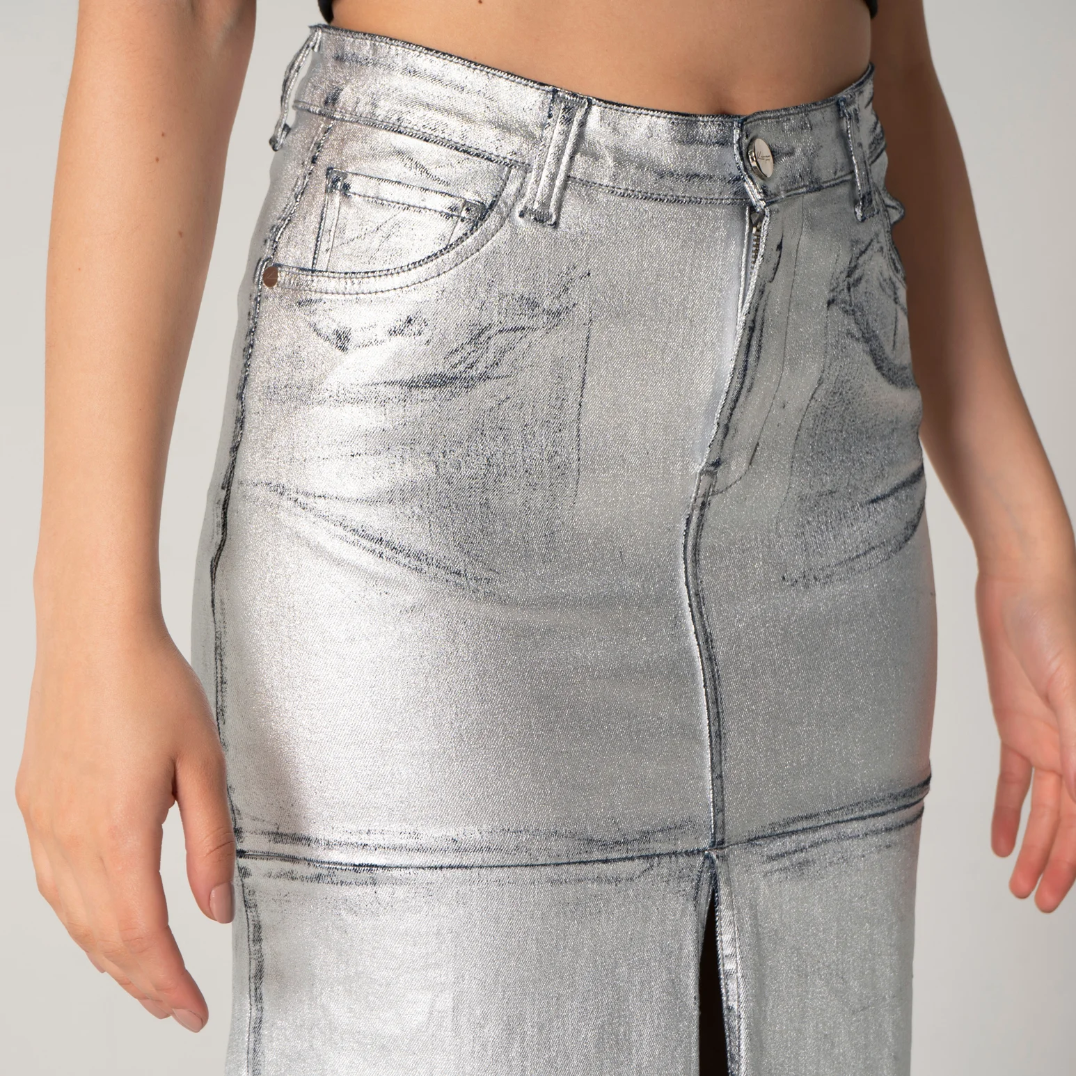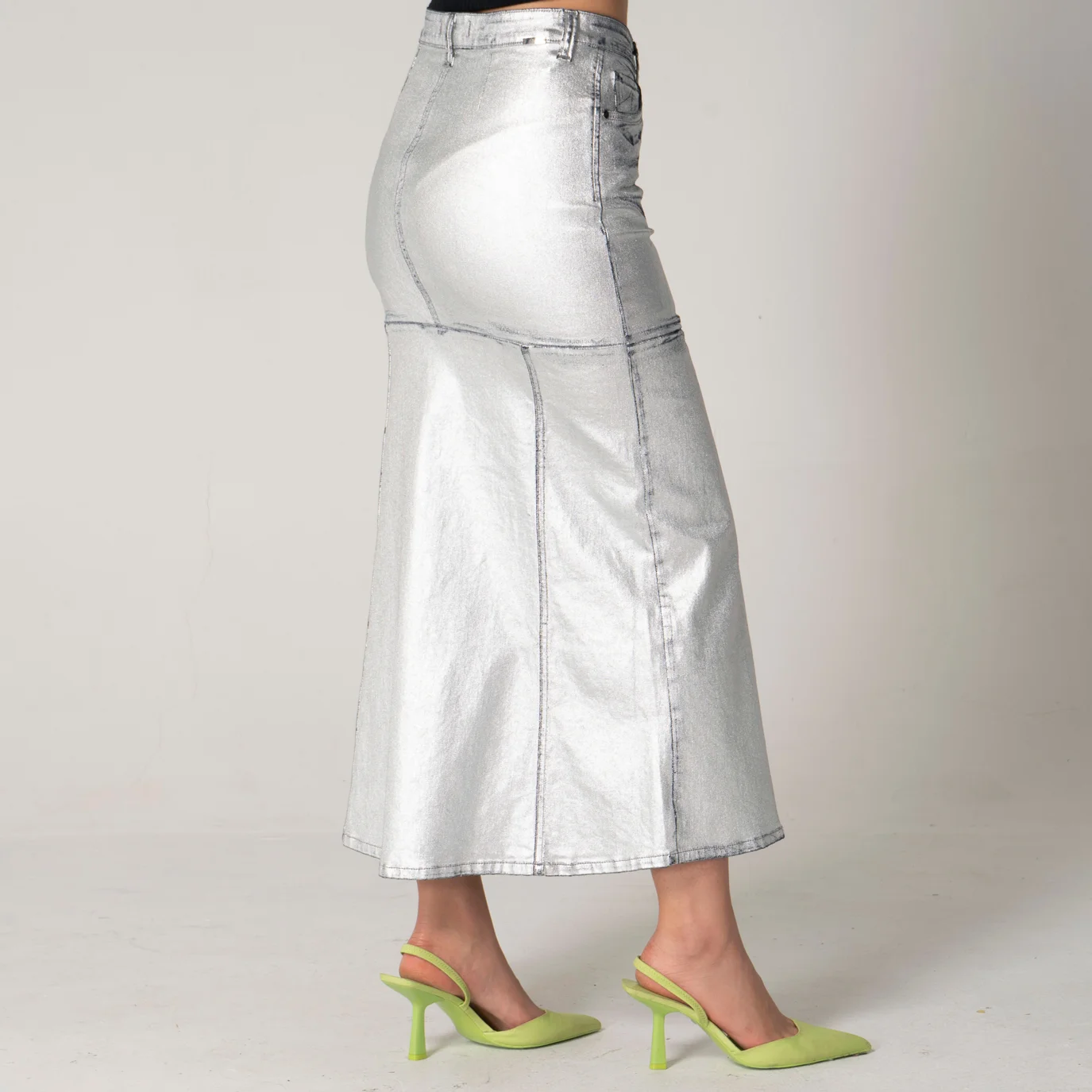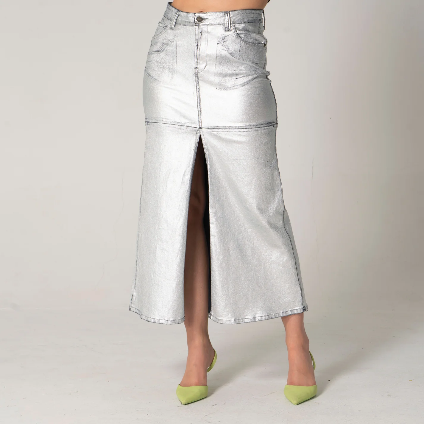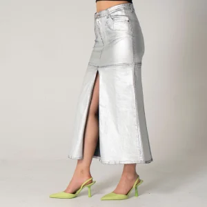 Falda larga SHN en denim metalizado es una prenda elegante y moderna que combina estilo y comodidad. Su diseño está realzado por una pretina de un solo botón que aporta un toque sofisticado. En la parte frontal, incluye prácticos bolsillos redondos y un bolsillo relojero, que se complementan con un detalle de abertura, añadiendo un elemento distintivo.