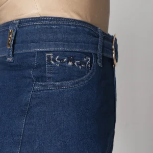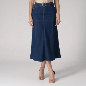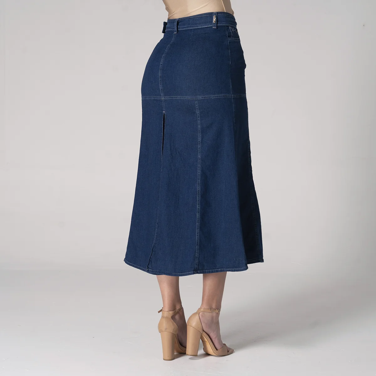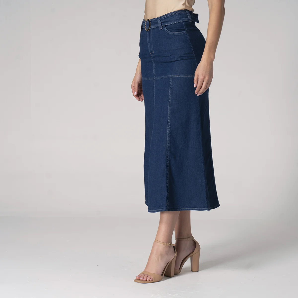 Falda larga Kenbleu en denim silueta slim realza la figura de manera elegante y moderna. Está diseñada con una pretina de un solo botón que asegura un ajuste cómodo y seguro. En la parte posterior, cuenta con bolsillos redondos que añaden un toque clásico y funcional, además de un relojero decorativo con detalles de bordado que le brindan un toque distintivo y femenino. Incluye un cinturón para ajustar la cintura según preferencia y una abertura en la parte posterior que facilita el movimiento y aporta un estilo sofisticado.