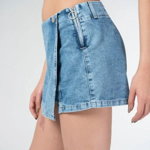 Falda short Dramatic en denim, silueta Slim, detalle de superposición en mismo tejido. cierre lateral con cremallera y detalle de vivo, esta falda y short para mujer es perfecta para un día soleado o de viaje.