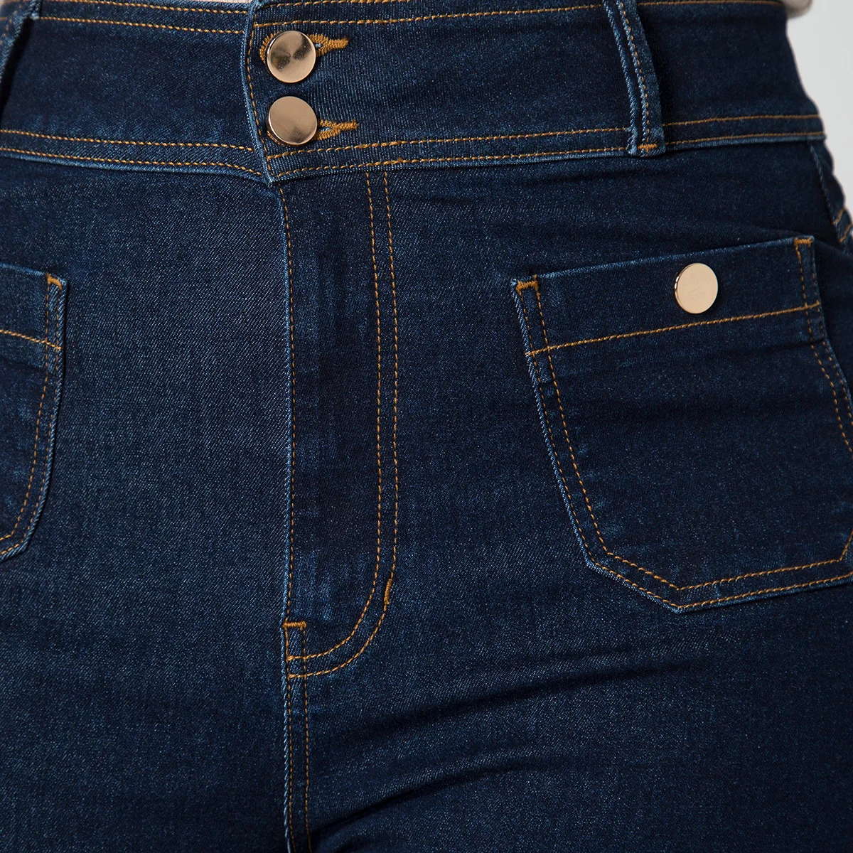 El diseño incluye un cierre de broche, que añade un toque sofisticado y facilita su uso. Las botas del pantalón están adornadas con charreteras decorativas con cierre de broche, lo que le otorga un detalle distintivo y contemporáneo. En la parte posterior, se aprecia un par de bolsillos tipo parche, que no solo son estéticamente agradables, sino que también ofrecen espacio adicional para llevar pequeños objetos.