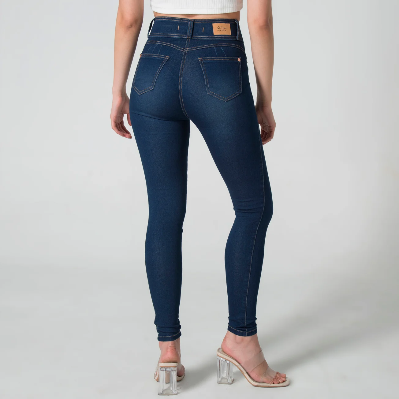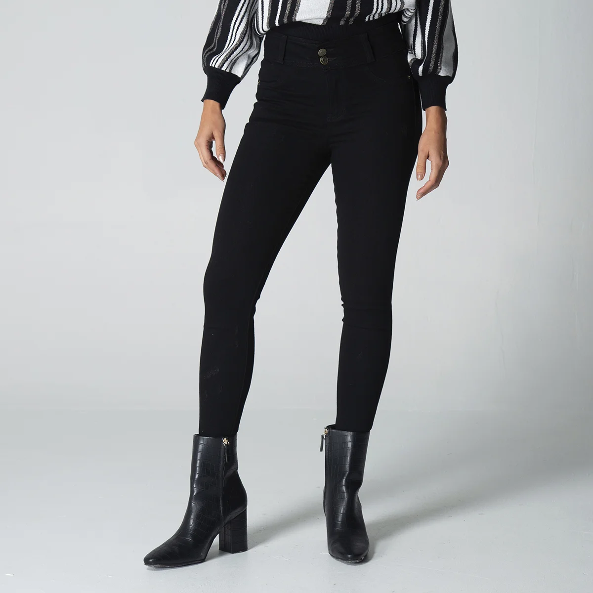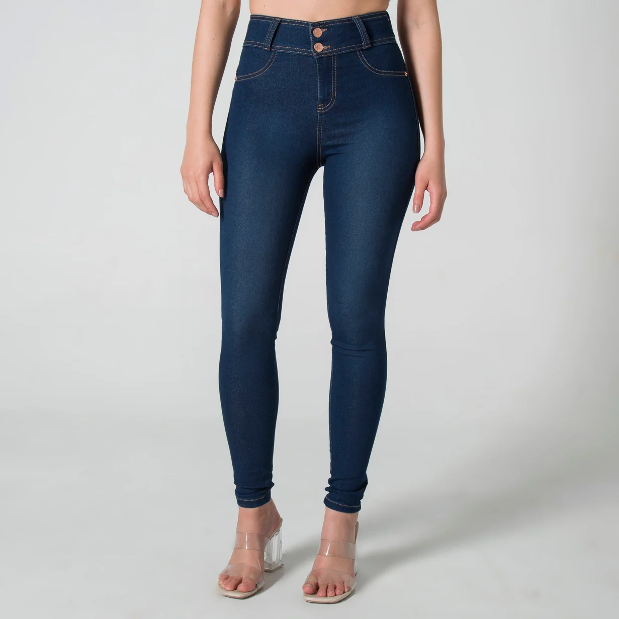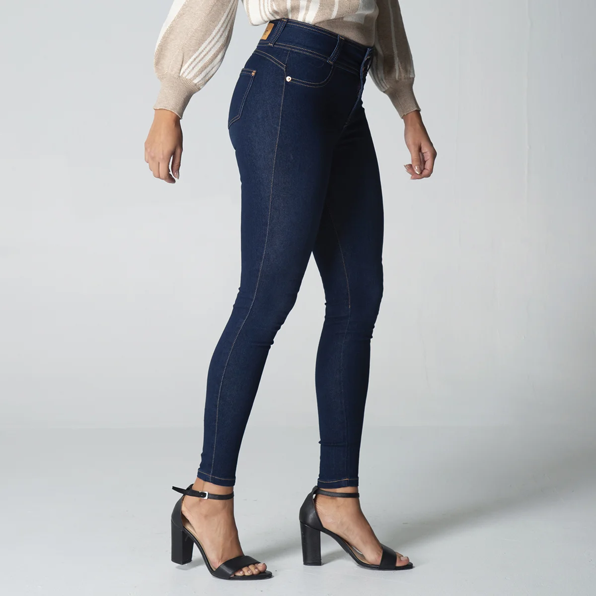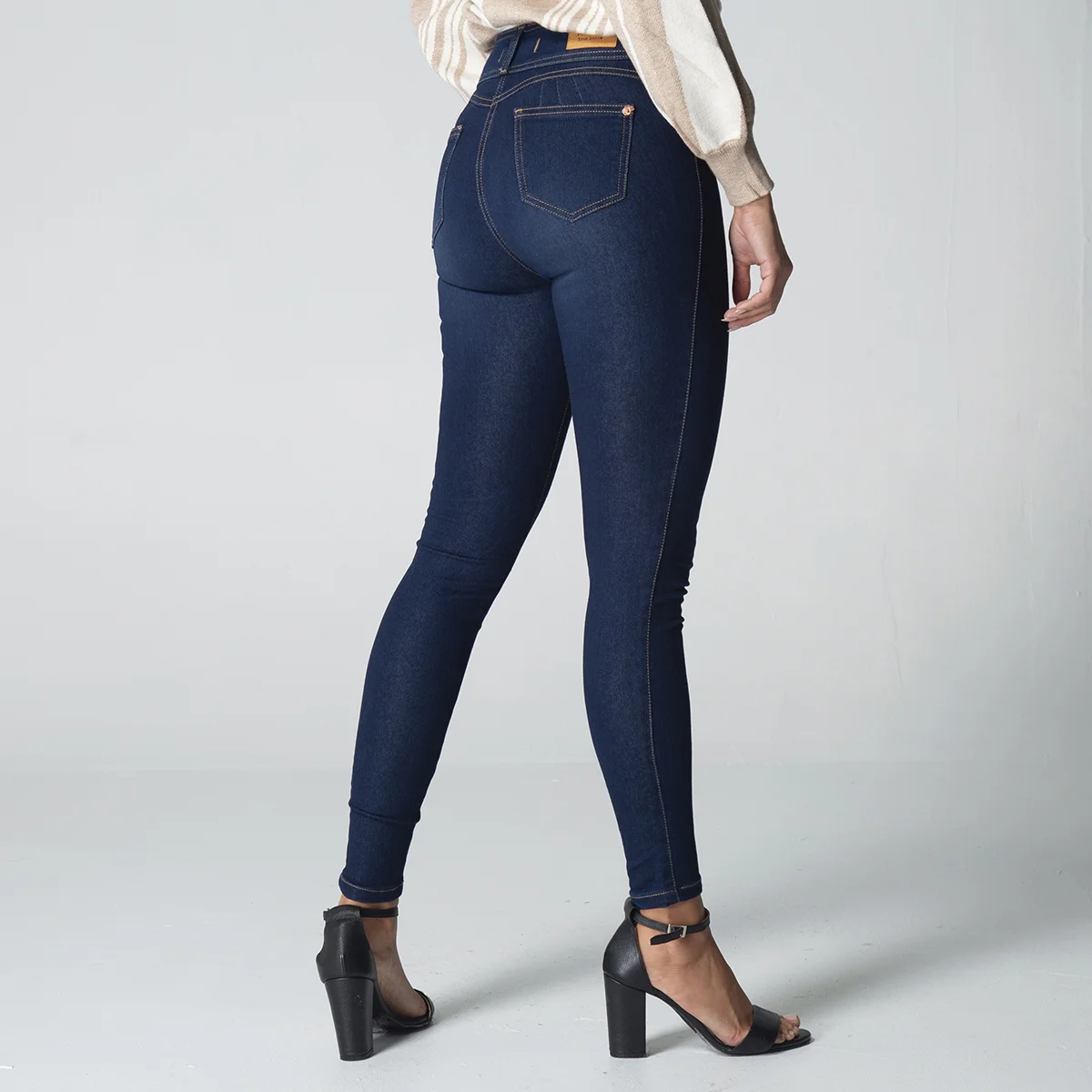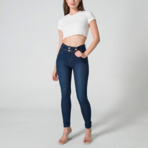 pantalón Donne en denim, presentando una silueta skinny que se ajusta perfectamente al cuerpo, realzando la figura. La pretina de un botón proporciona un cierre seguro y cómodo, mientras que su diseño se complementa con bolsillos redondos en la parte frontal, ideales para un toque práctico y estilizado. Además, cuenta con un bolsillo relojero, perfecto para guardar pequeños objetos.