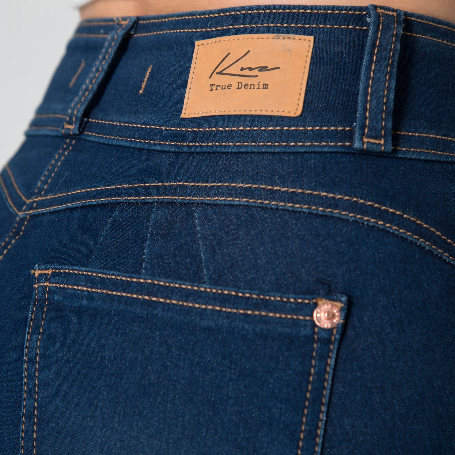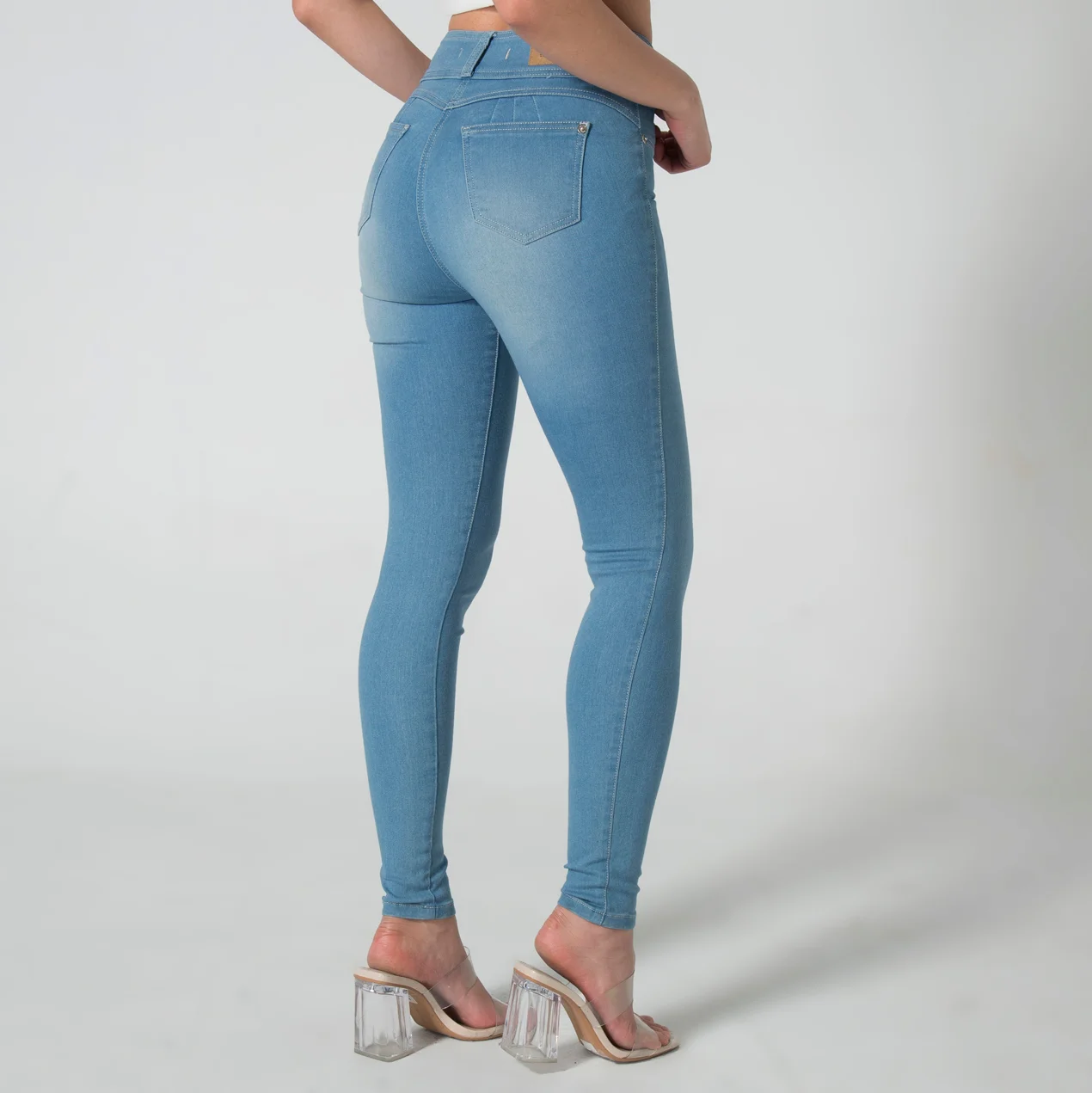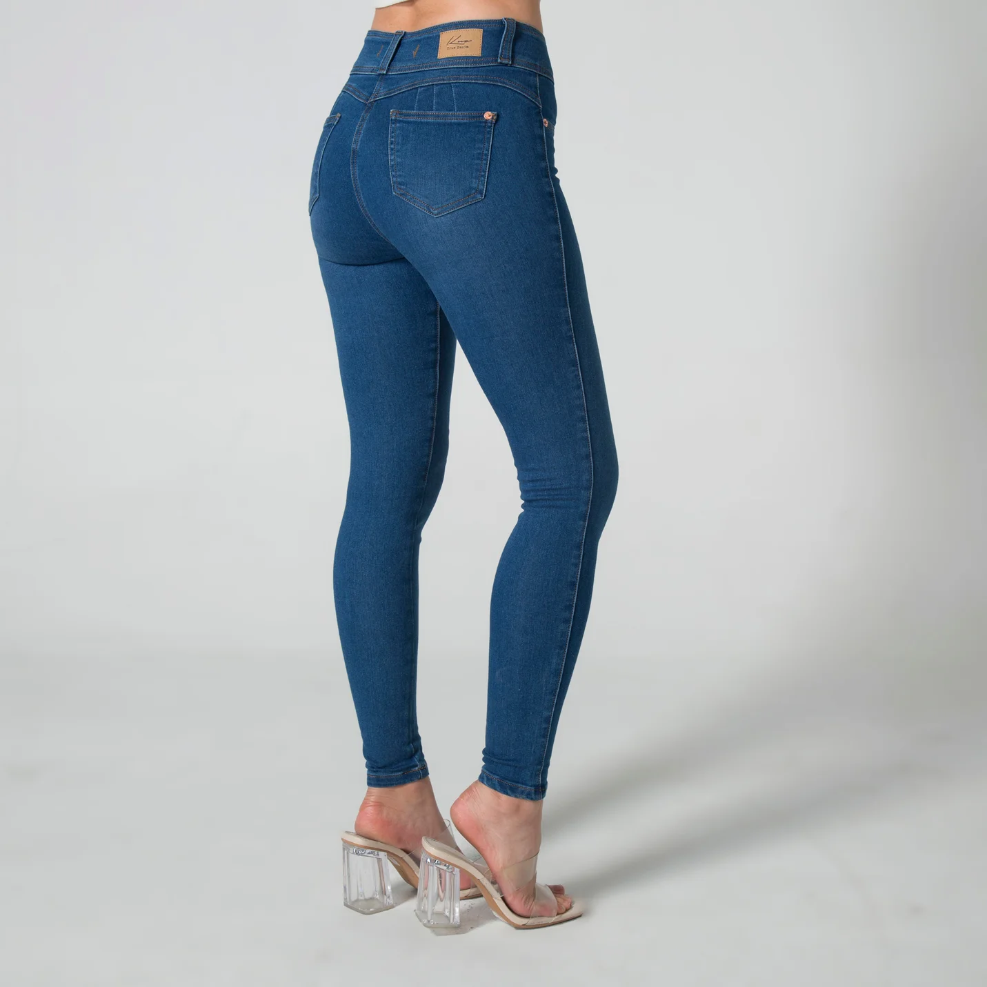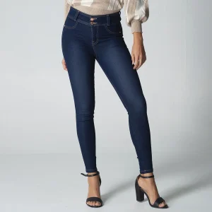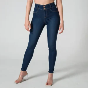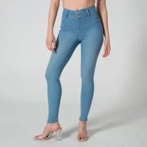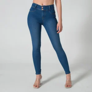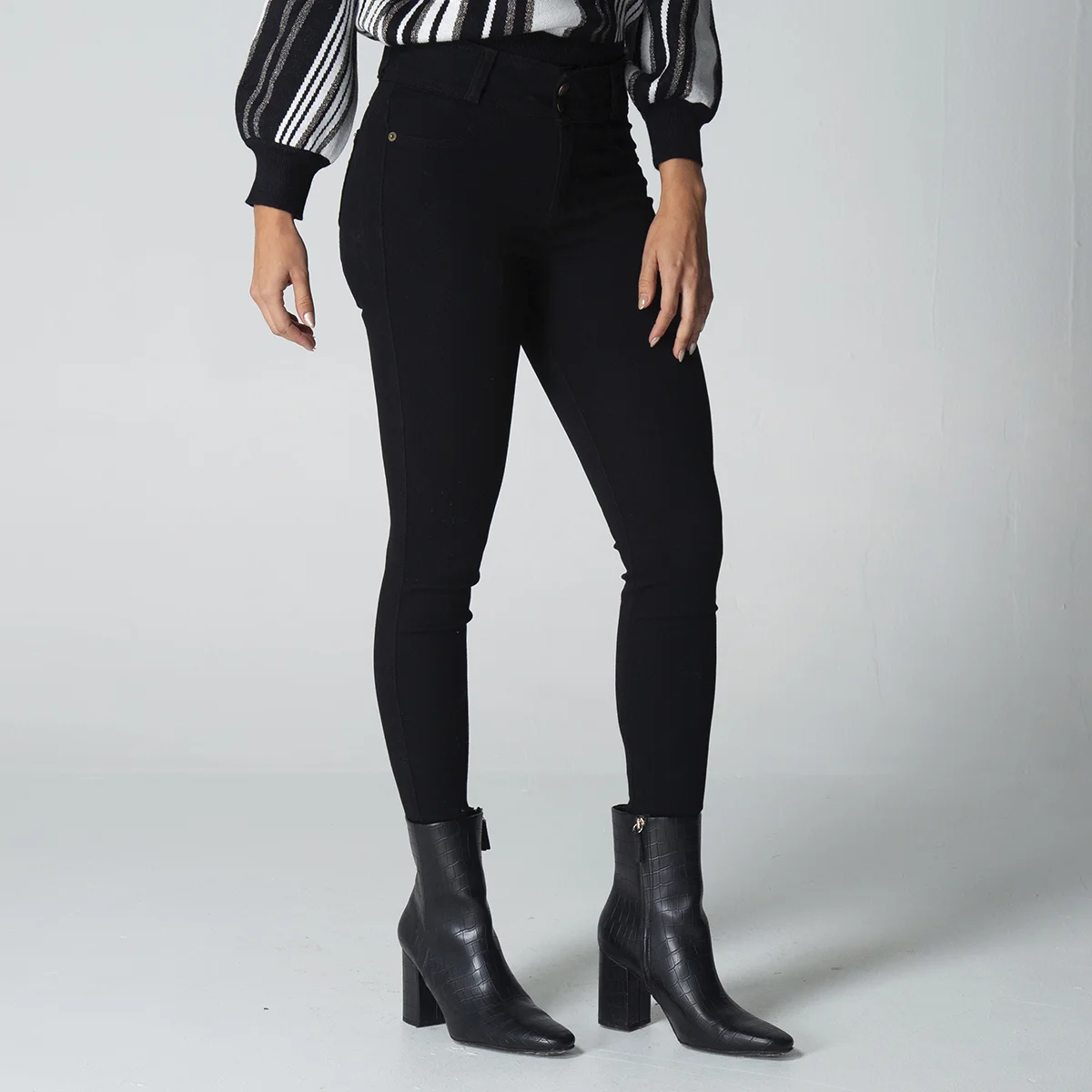 pantalón Donne en denim, presentando una silueta skinny que se ajusta perfectamente al cuerpo, realzando la figura. La pretina de un botón proporciona un cierre seguro y cómodo, mientras que su diseño se complementa con bolsillos redondos en la parte frontal, ideales para un toque práctico y estilizado. Además, cuenta con un bolsillo relojero, perfecto para guardar pequeños objetos.