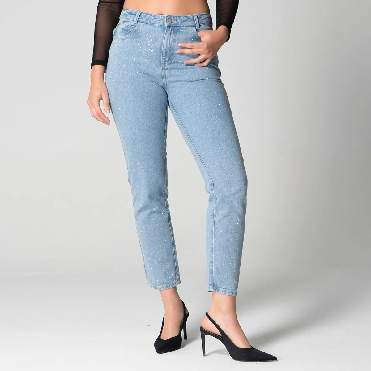 Jean Desires en denim silueta Mom fit combinando estilo y funcionalidad, Cuenta con una pretina de un solo botón que garantiza un ajuste cómodo y seguro. En la parte frontal presenta bolsillos redondos y un relojero ideal para llevar pequeños objetos con facilidad.
