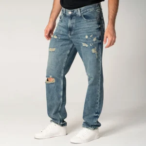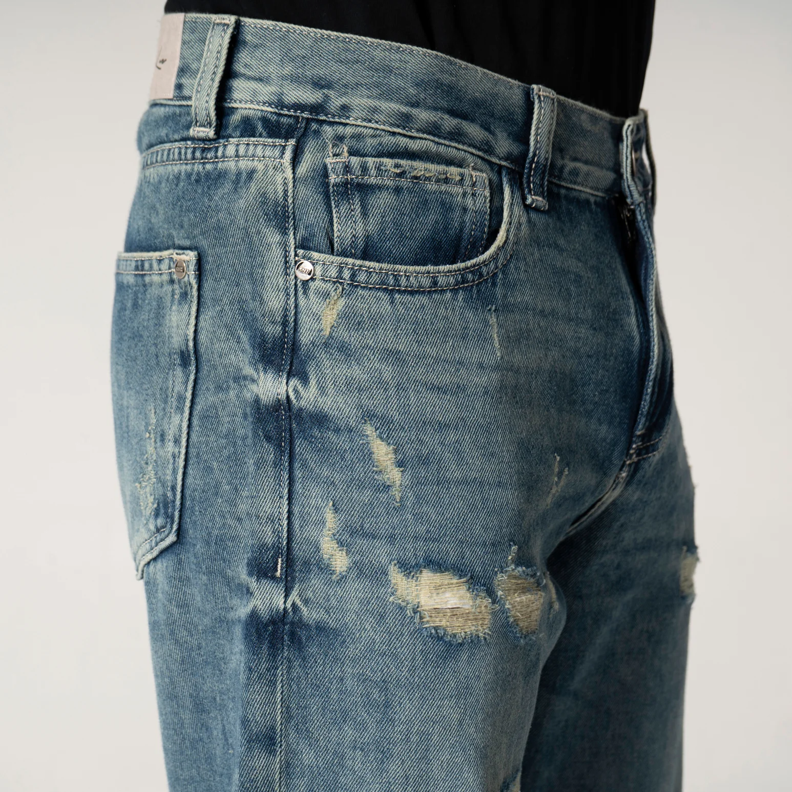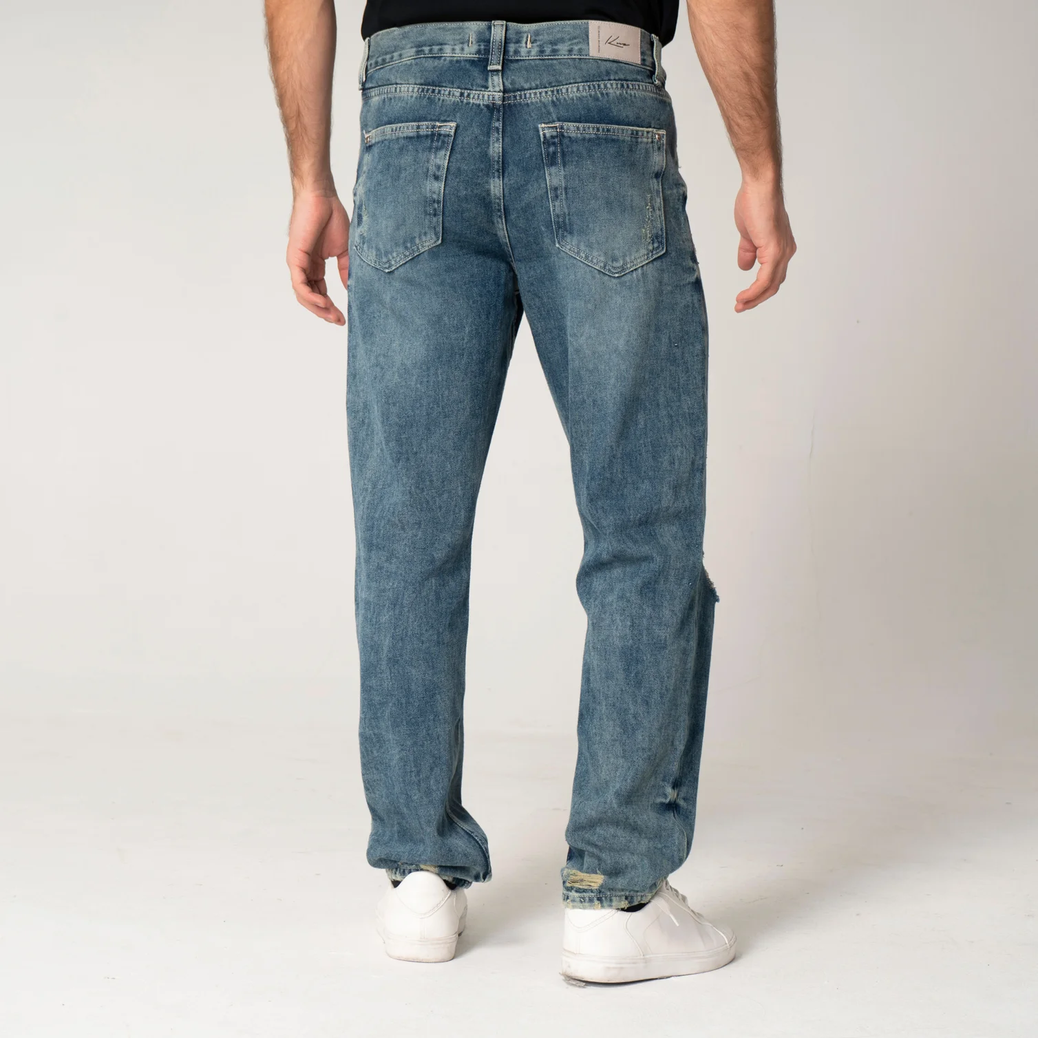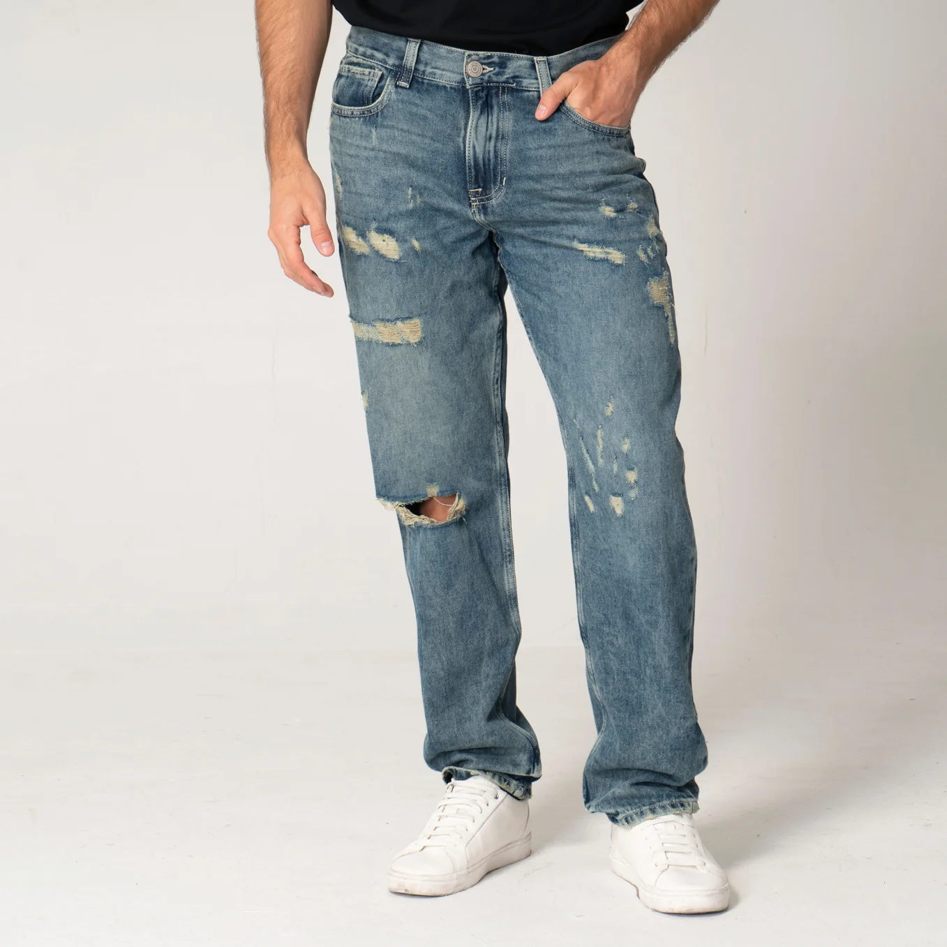 Pantalón Never en denim es una opción clásica y versátil para cualquier ocasión su silueta regular brinda comodidad y estilo, mientras que la pretina de un solo botón le da un toque elegante los bolsillos redondos y relojero en la parte frontal añaden un detalle práctico, y los bolsillos tipo parche en la parte posterior completan su diseño. Un jean para hombre funcional y moderno con rotos y desgastes para un toque urbano.