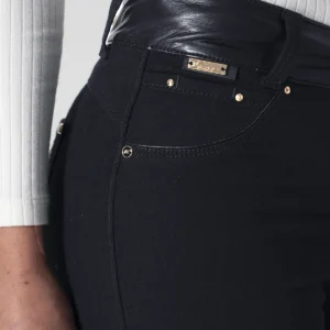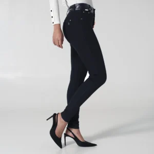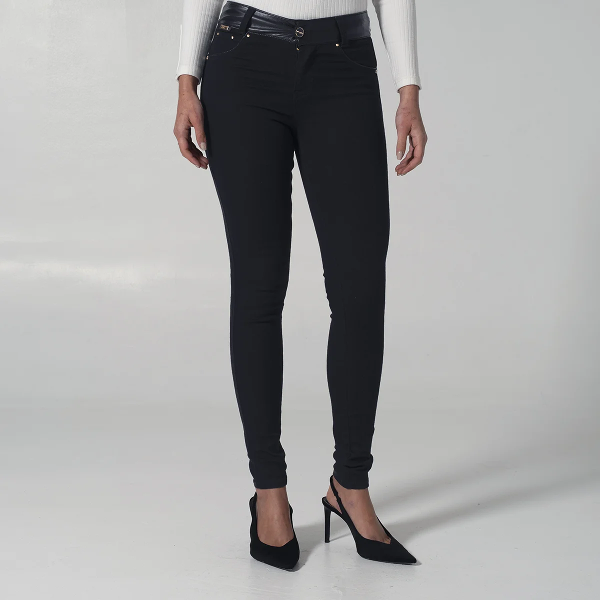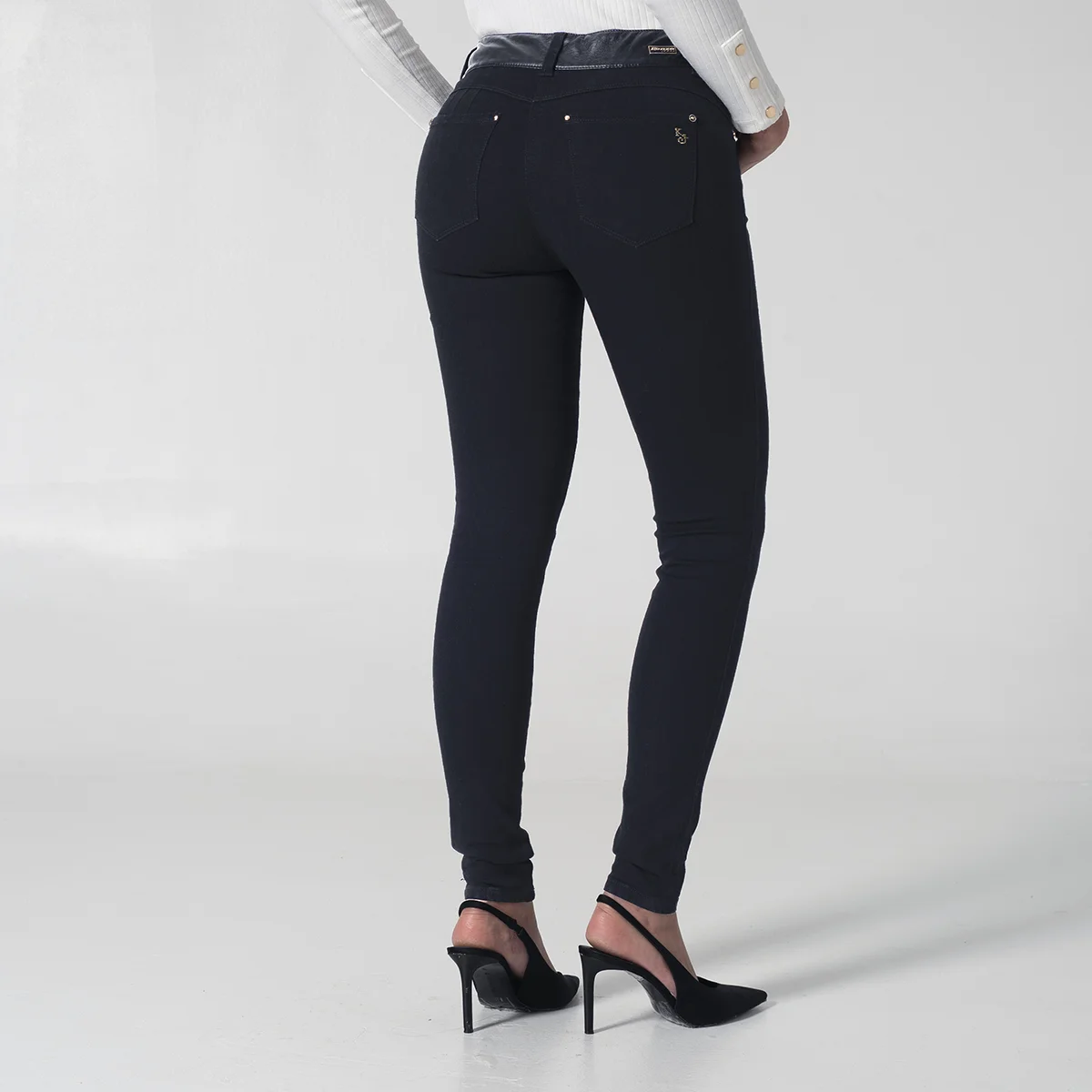Pantalón Destiny en denim presenta un diseño moderno y estilizado, La pretina está confeccionada en material sintético complementada con un botón y cierre de cremallera para mayor comodidad y ajuste, En la parte frontal cuenta con una imitación de bolsillos redondos decorados con detalles de vivo en material sintético que añaden un toque de contraste y estilo, En la parte posterior dispone de bolsillos tipo parche y pinzas que realzan la silueta y aportan un acabado sofisticado, este jean para mujer es ideal para quienes buscan un pantalón denim con detalles únicos y actuales.