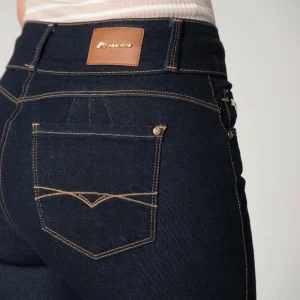 En su parte frontal, este jean para mujer presenta bolsillos redondos y un bolsillo relojero, aportando un toque clásico y funcional. La parte posterior incluye bolsillos tipo parche, estratégicamente ubicados para ofrecer un realce atractivo, además de pinzas que favorecen la silueta.