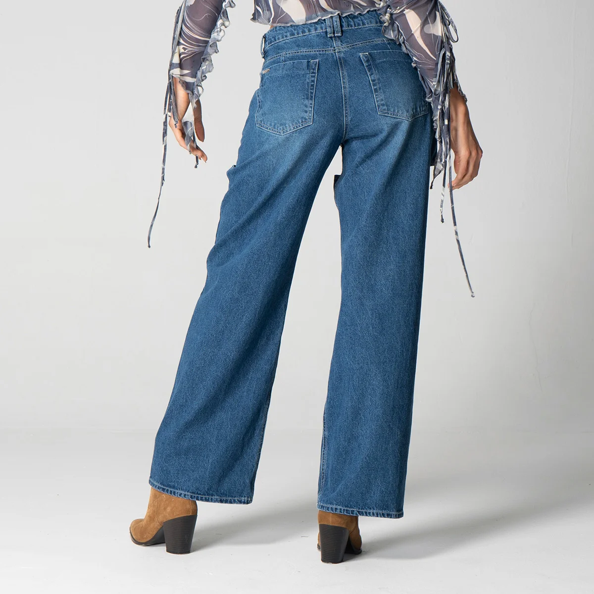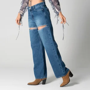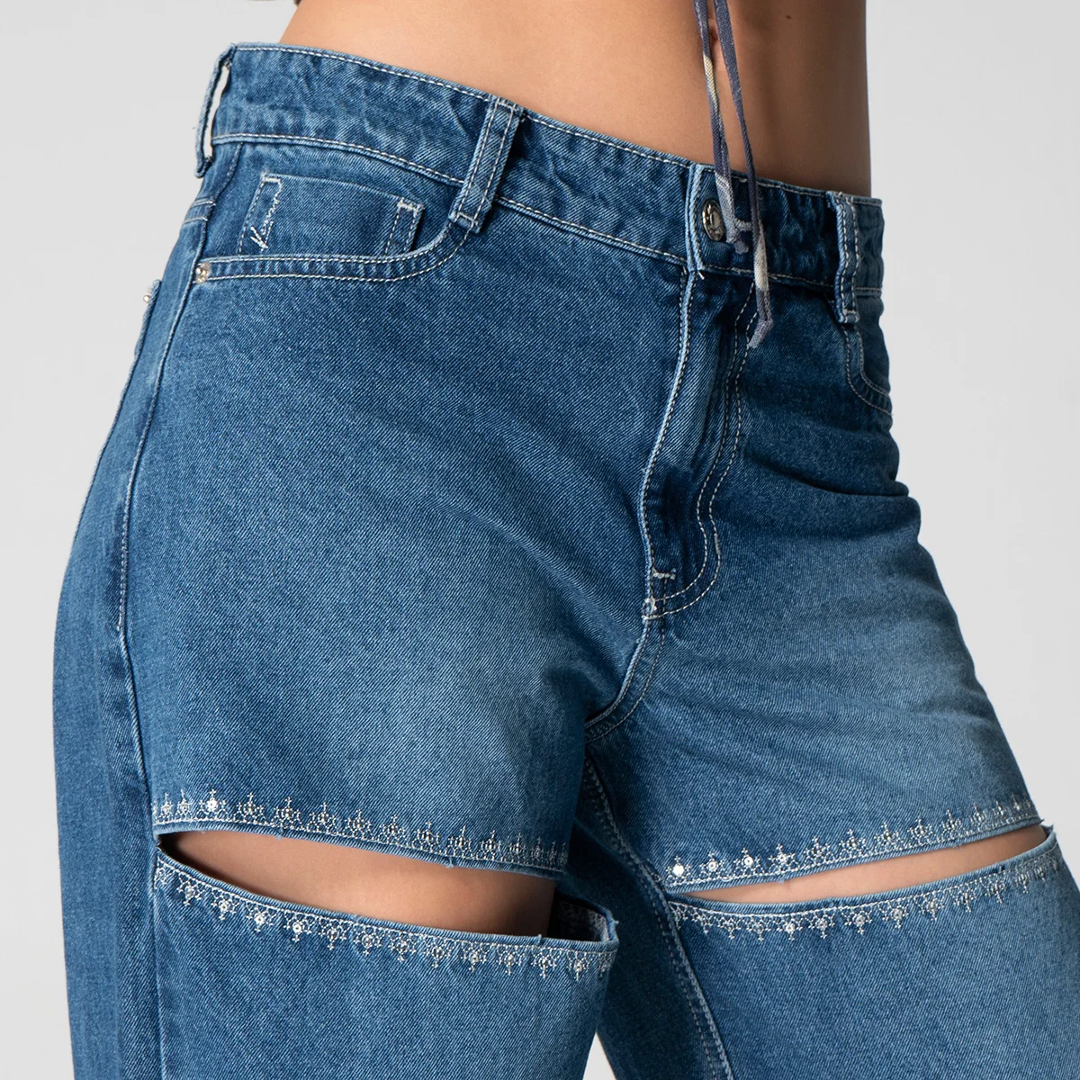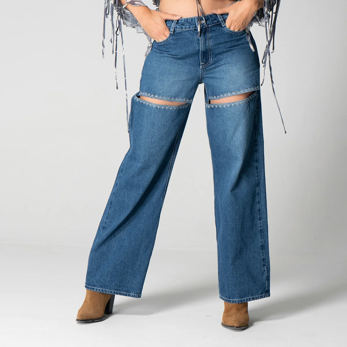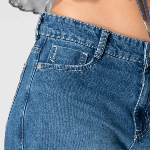 Una de las principales características de este modelo es la abertura en el muslo, que no solo brinda un toque de frescura, sino que también está adornada con un bordado decorativo que le da un aire distintivo y contemporáneo. En la parte posterior, los bolsillos tipo parche aportan un detalle adicional y son ideales para un uso diario.