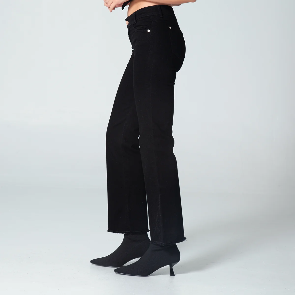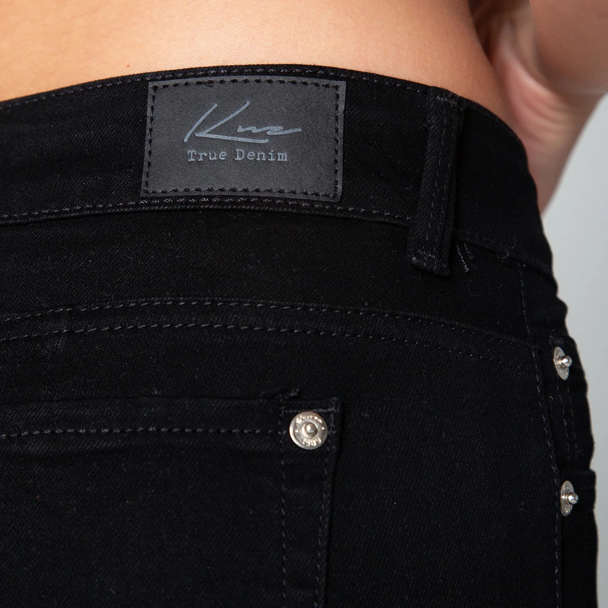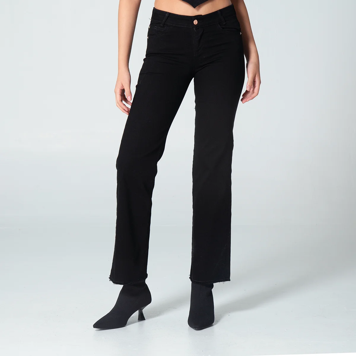 Pantalón Louie en denim presenta el clásico y moderno tiro bajo, con una pretina que se asegura con un solo botón, en su parte frontal, el diseño tradicional de cinco bolsillos incluye bolsillos redondos y un práctico bolsillo relojero.