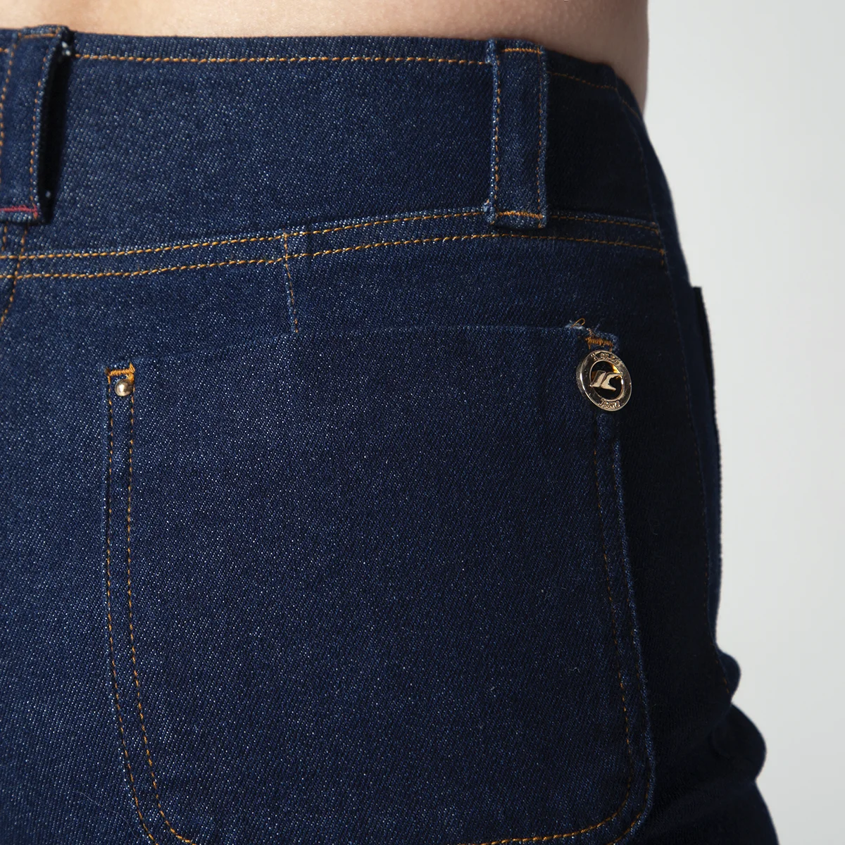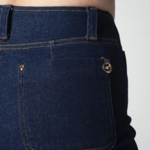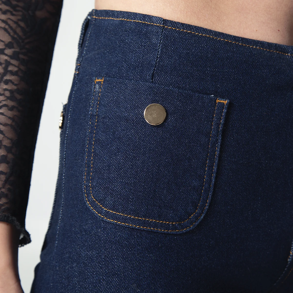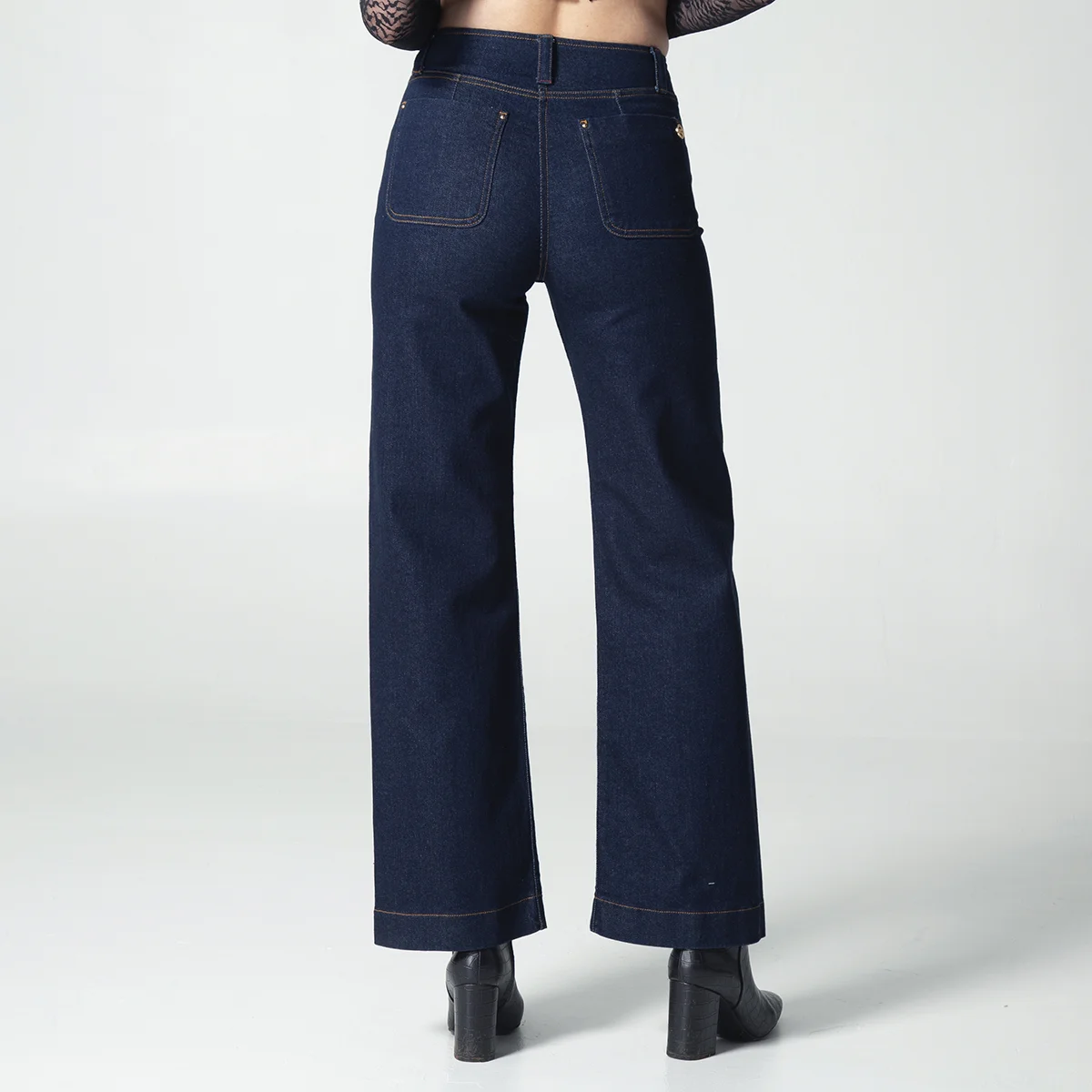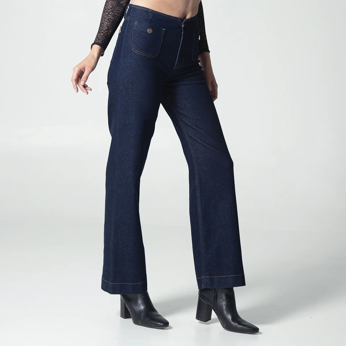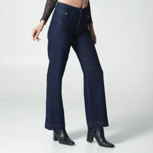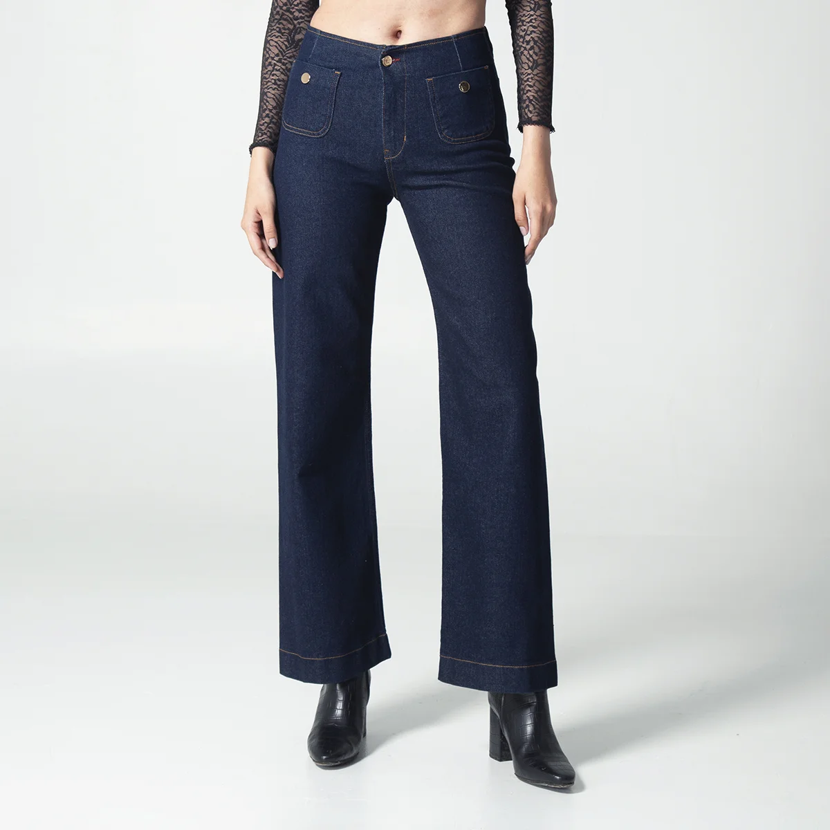 Jean Darky confeccionado denim presenta una moderna silueta wide leg para un estilo holgado y cómodo, Su diseño se distingue por la ausencia de pretina y de costura en los costados, lo que le otorga una estética limpia y fluida. Tanto en la parte frontal como en la posterior, incorpora prácticos bolsillos tipo parche con un elegante corte curvo, combinando funcionalidad con un detalle de diseño distintivo.