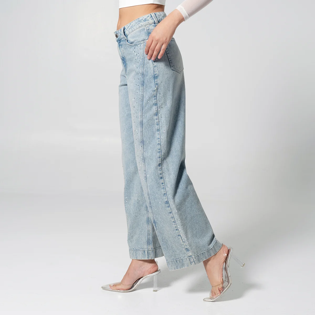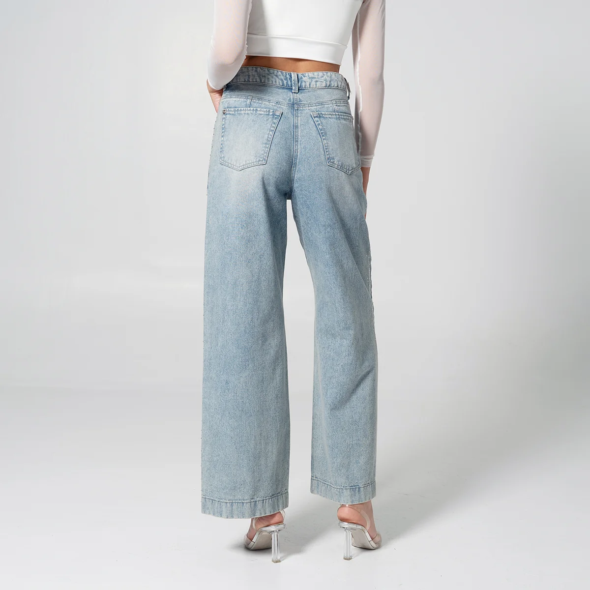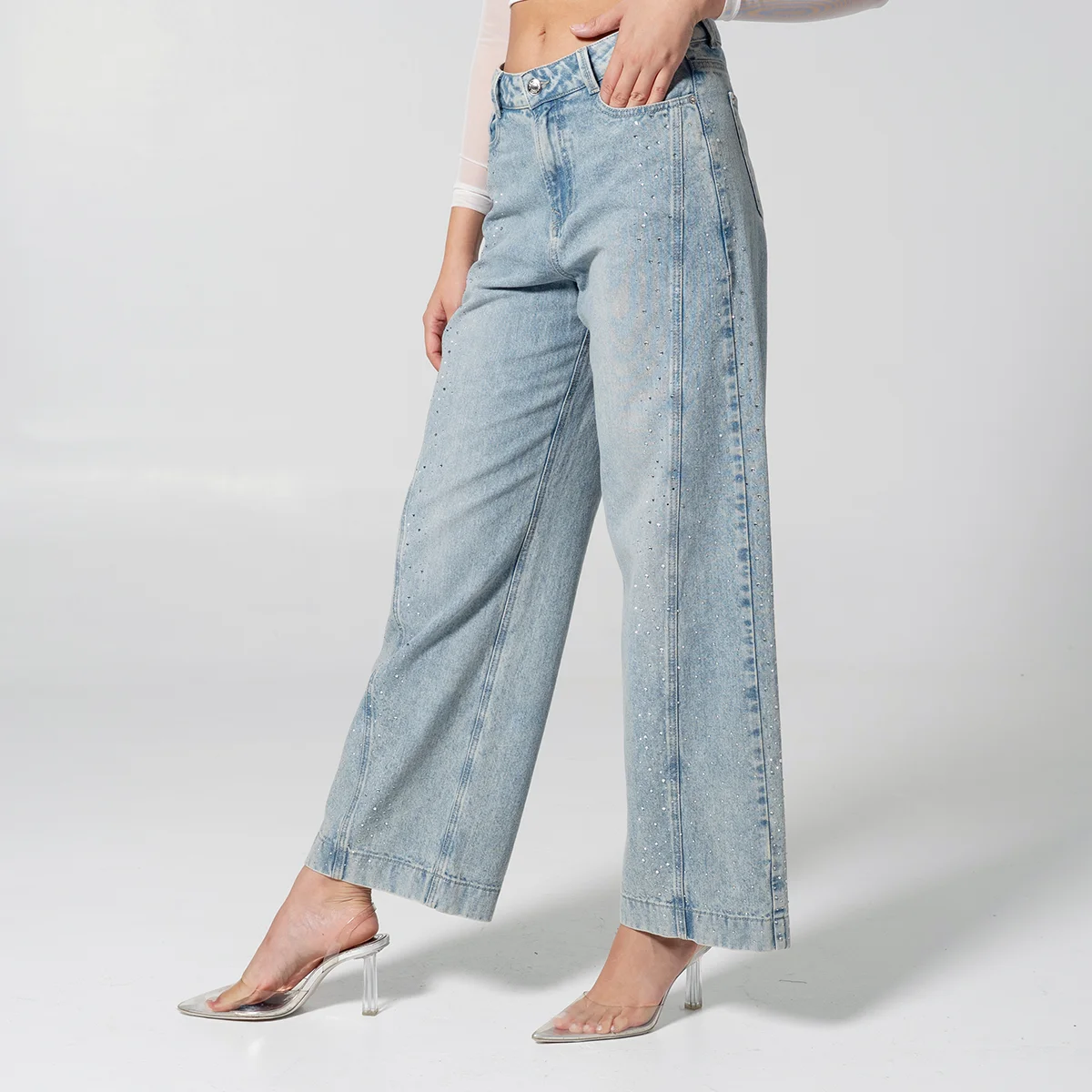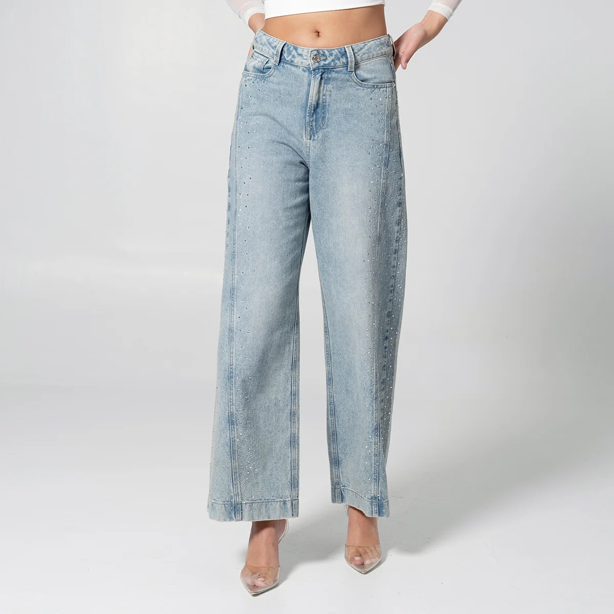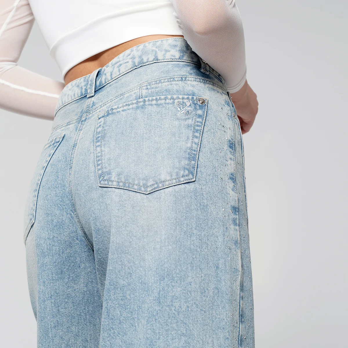 El pantalón Eternity en Denim silueta wide leg de tendencia que combina estilo moderno con detalles distintivos para un look impactante, Su diseño frontal es notablemente sofisticado presentando un corte en diagonal complementado por delicados detalles en pedrería que aportan un toque de brillo único, además de incluir funcionales bolsillos redondos y un bolsillo relojero, La parte posterior mantiene la utilidad con dos bolsillos tipo parche de diseño clásico. Este pantalón para mujer es la elección ideal para elevar tu guardarropa con una prenda de mezclilla que destaca por su corte amplio y acabados detallados.