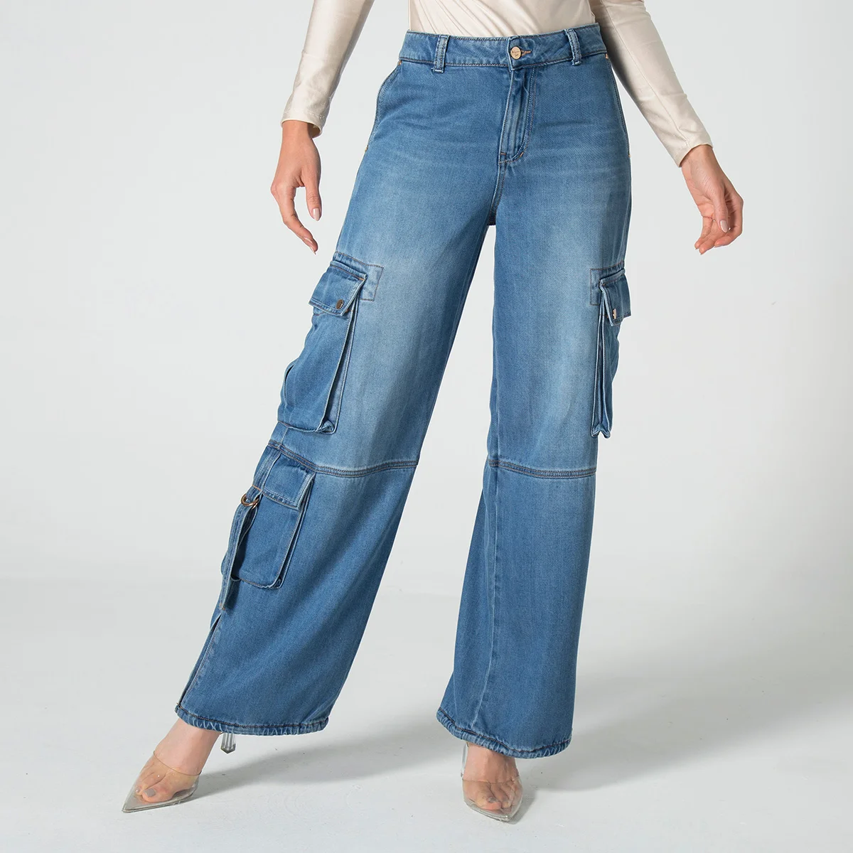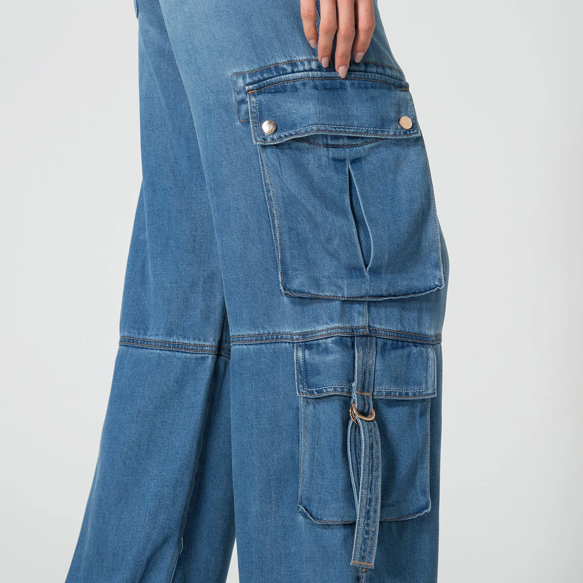 En la parte frontal, encontrarás prácticos bolsillos laterales tipo cargo, equipados con cierre de tapa y broche, perfectos para guardar tus esenciales con seguridad. La correa decorativa ajustable añade un toque distintivo y te permite personalizar tu look.