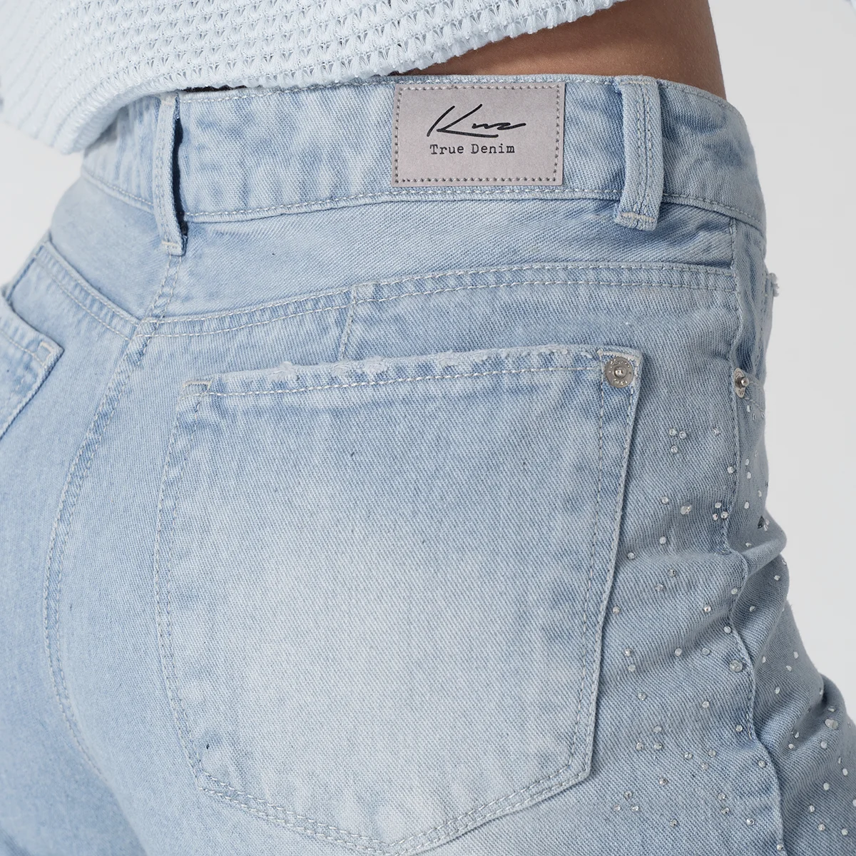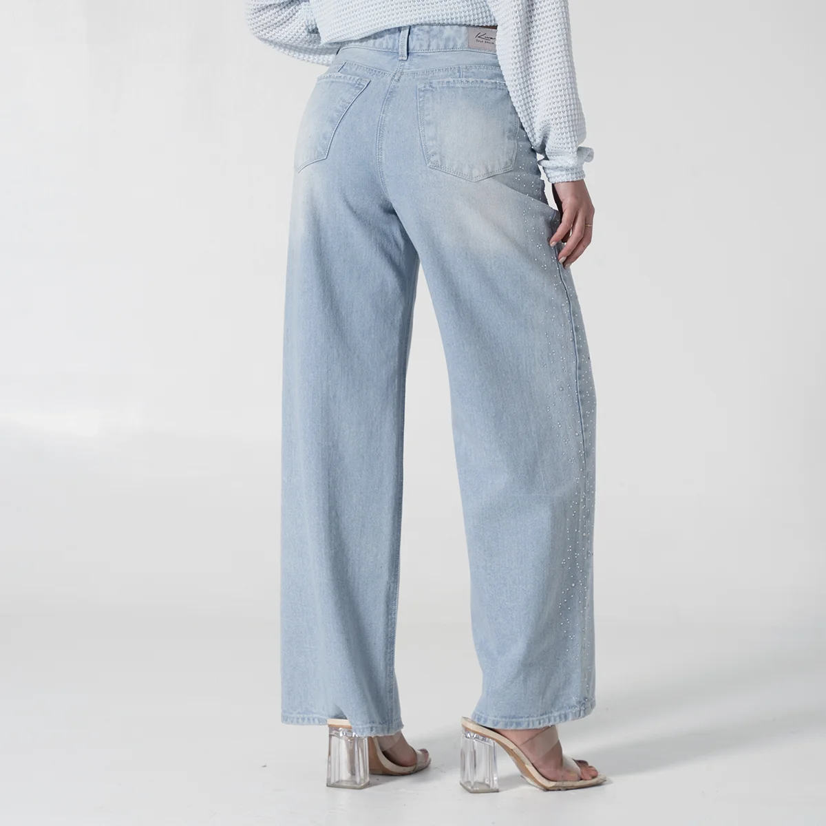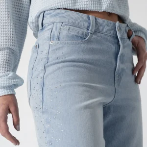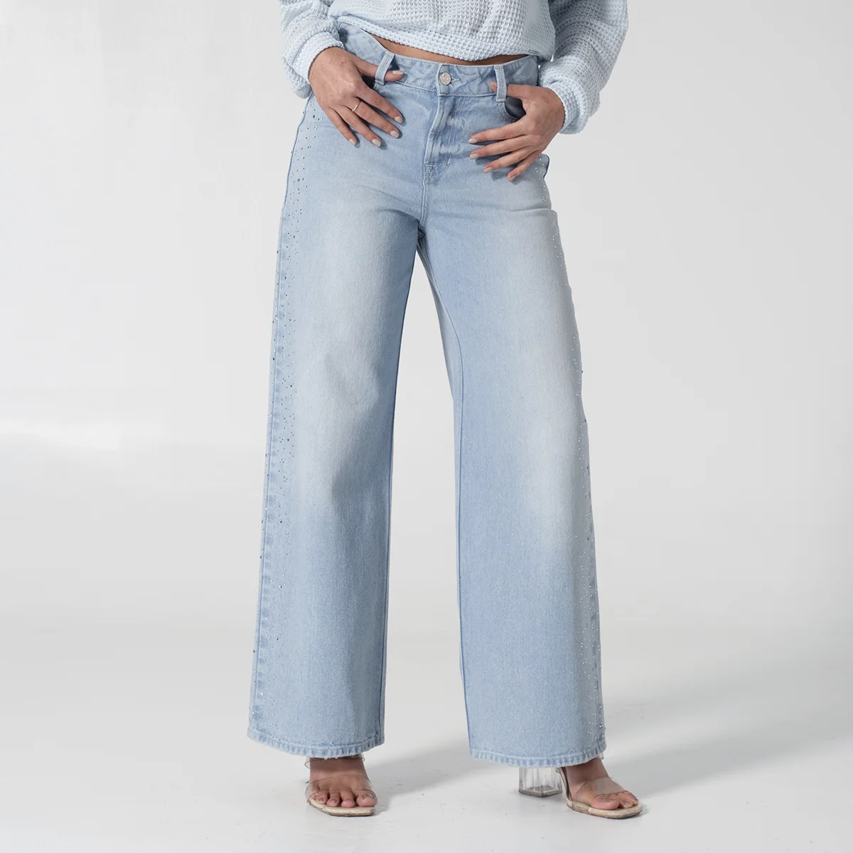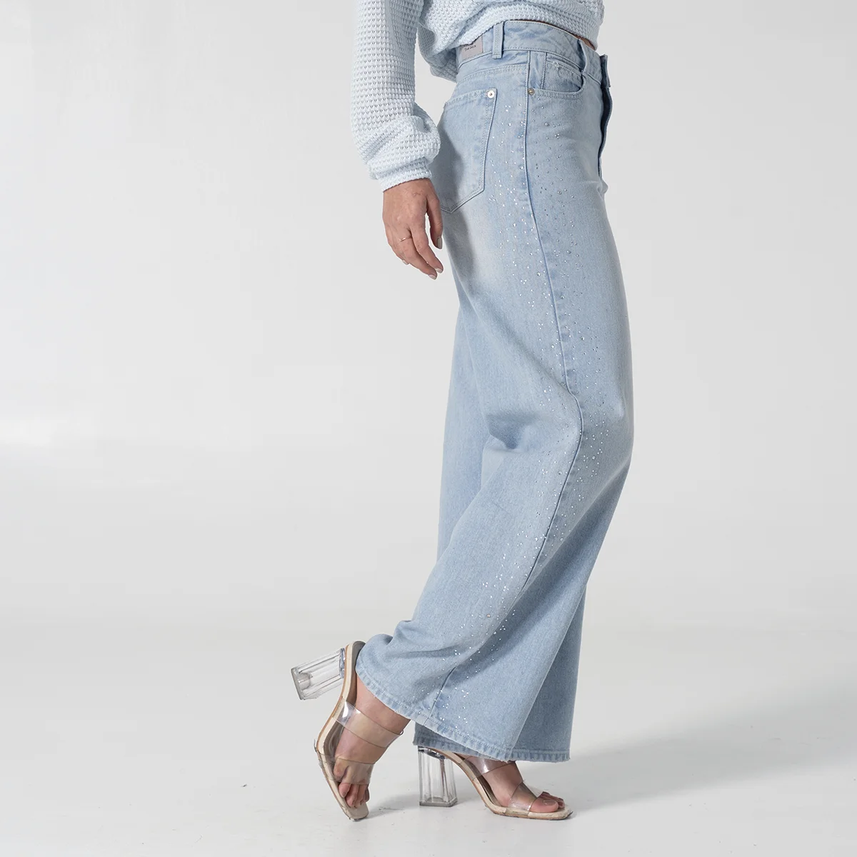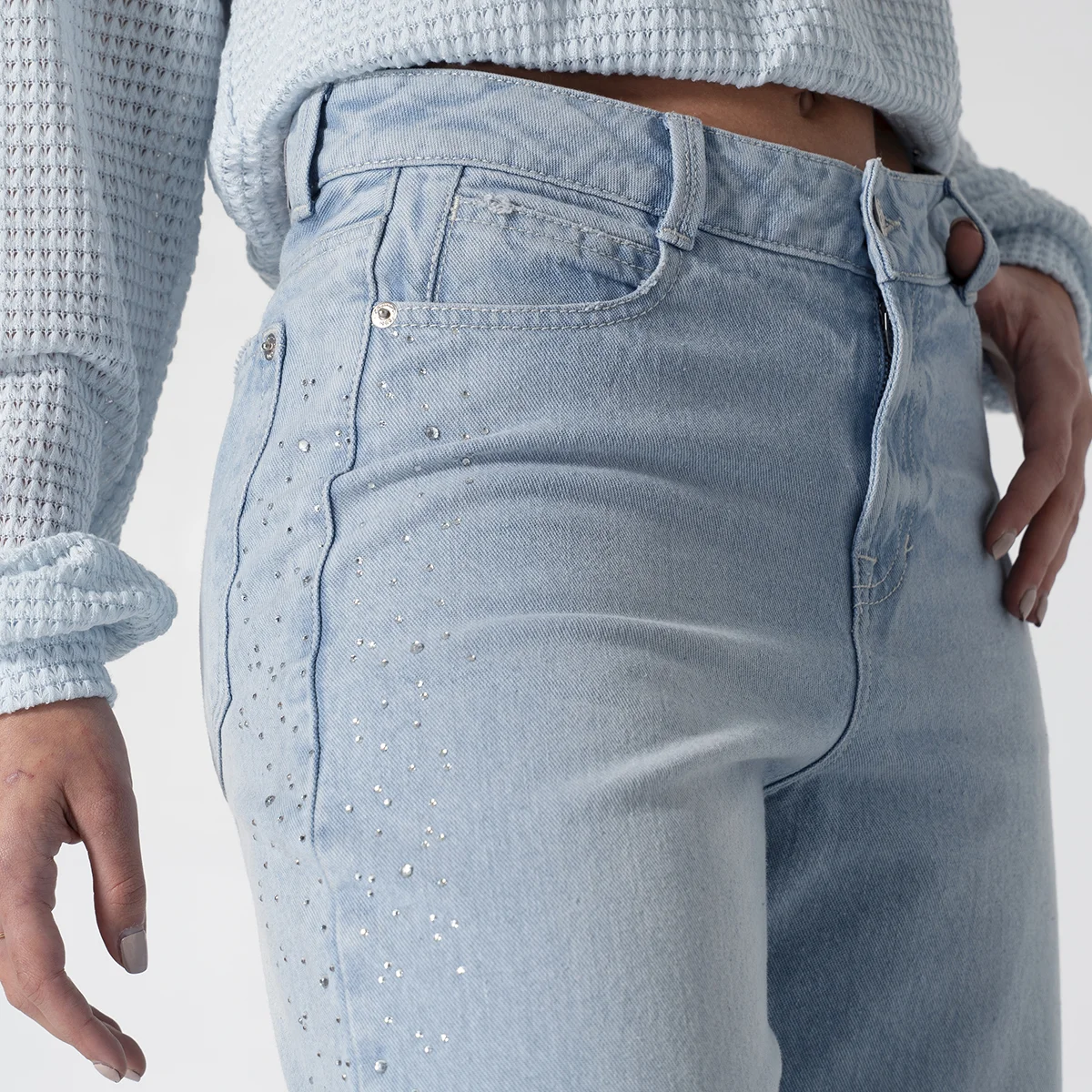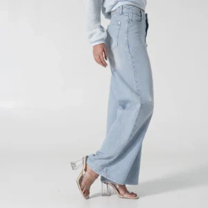 Jean Denim Talking de nuestra capsula Shiny Whimsy redefine el estilo casual con su silueta Wide Leg de tendencia ofreciendo comodidad y un look vanguardista, Este diseño destaca por sus bolsillos redondos frontales y el práctico bolsillo relojero, los cuales están sutilmente adornados con detalles de pedrería en los laterales añadiendo un toque de sofisticación y brillo completando su diseño clásico, la parte posterior cuenta con funcionales bolsillos tipo parche.