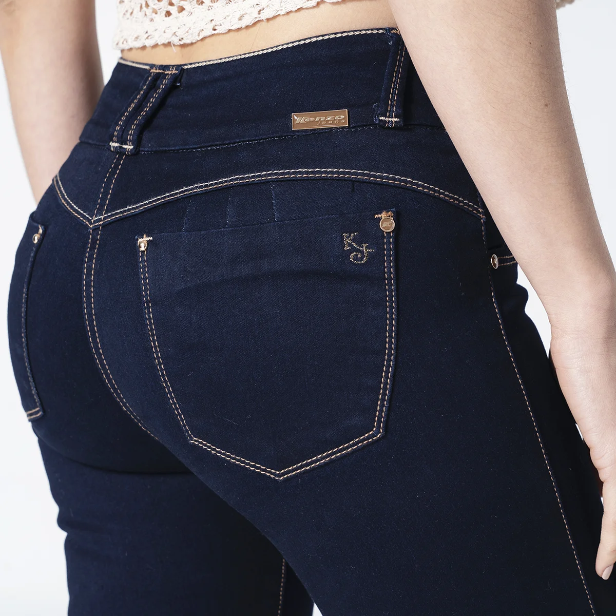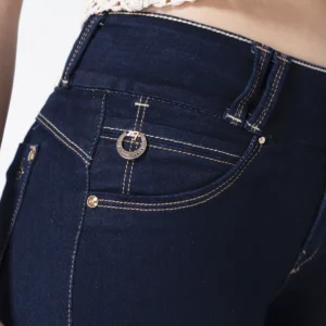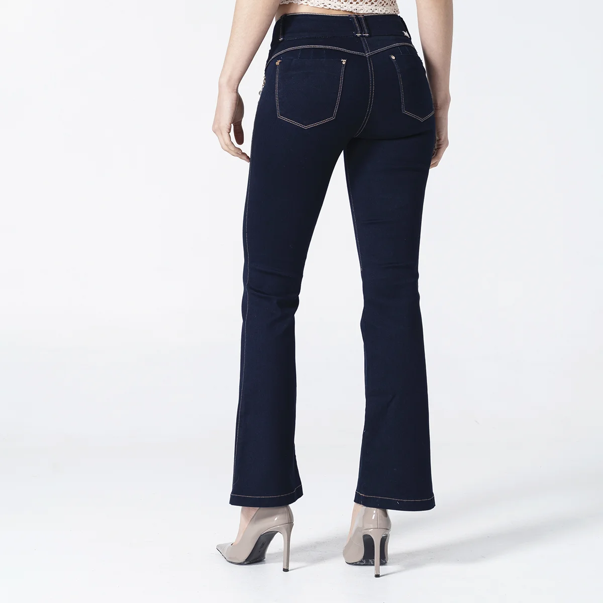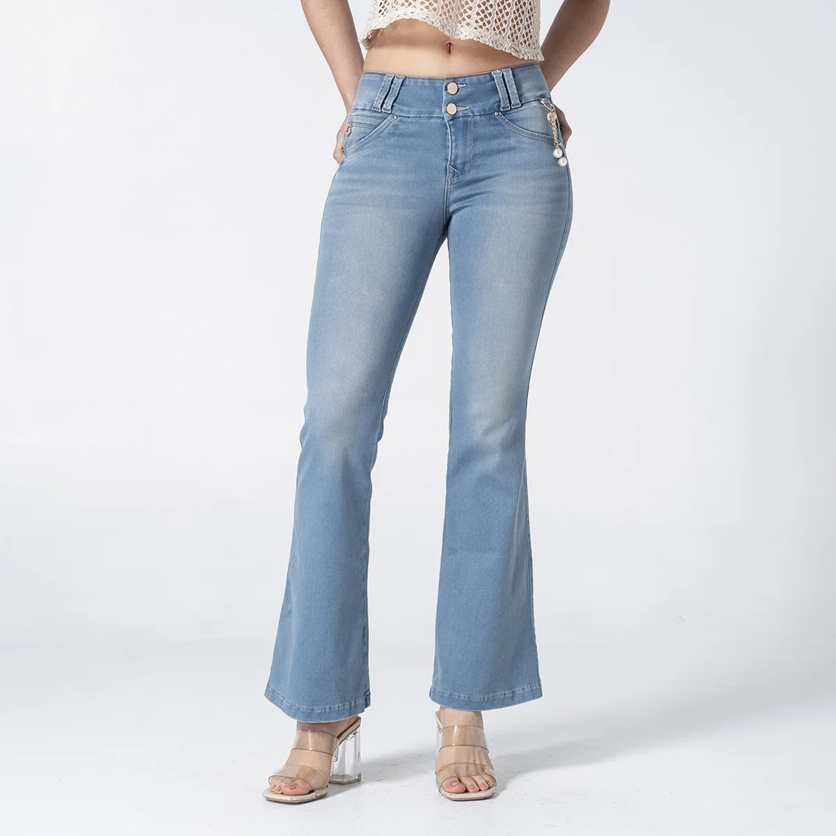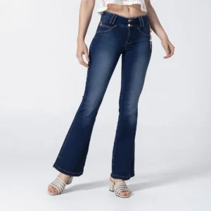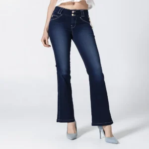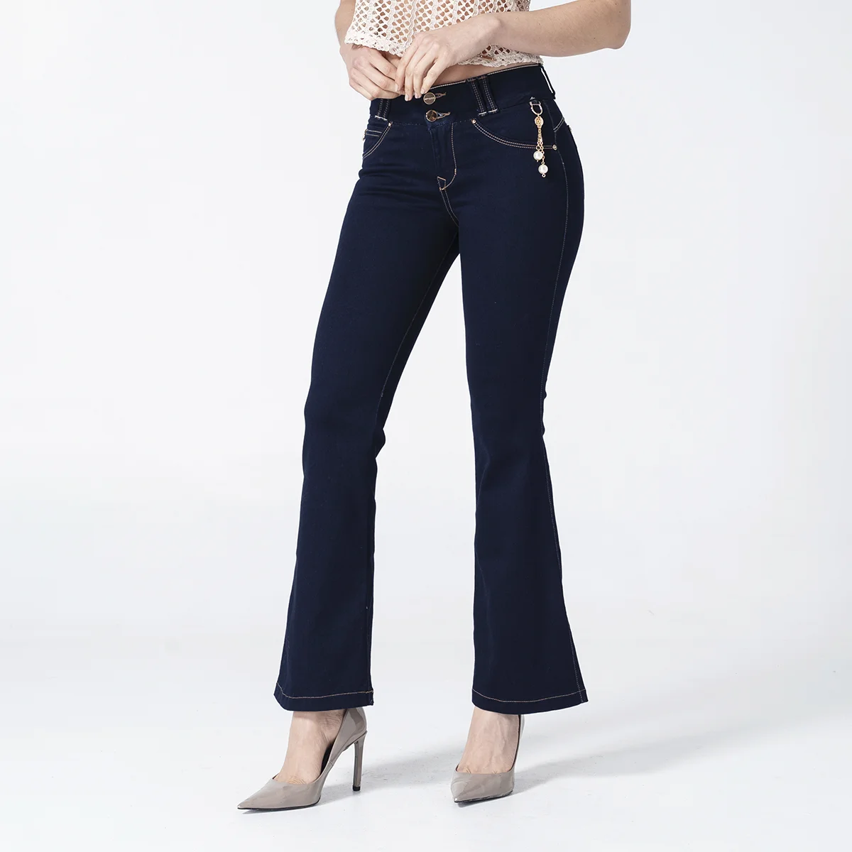 Luce una figura estilizada y a la vanguardia con nuestro pantalón Klux en denim, una prenda de silueta flare diseñada para realzar las curvas con un toque retro moderno, este jean para mujer destaca por su pretina de dos botones que ofrece un ajuste firme y cómodo complementado en el frente con una imitación de bolsillos y un relojero funcional que añade detalle sin sacrificar el diseño. En la parte posterior incorpora bolsillos tipo parche que mantienen la estética clásica de la mezclilla, mientras que su exclusivo accesorio decorativo en el delantero aporta un elemento diferenciador de alta tendencia, este jean para mujer es ideal para combinar con tacones o plataformas, este pantalón bota campana es la pieza clave para lograr un look sofisticado y femenino