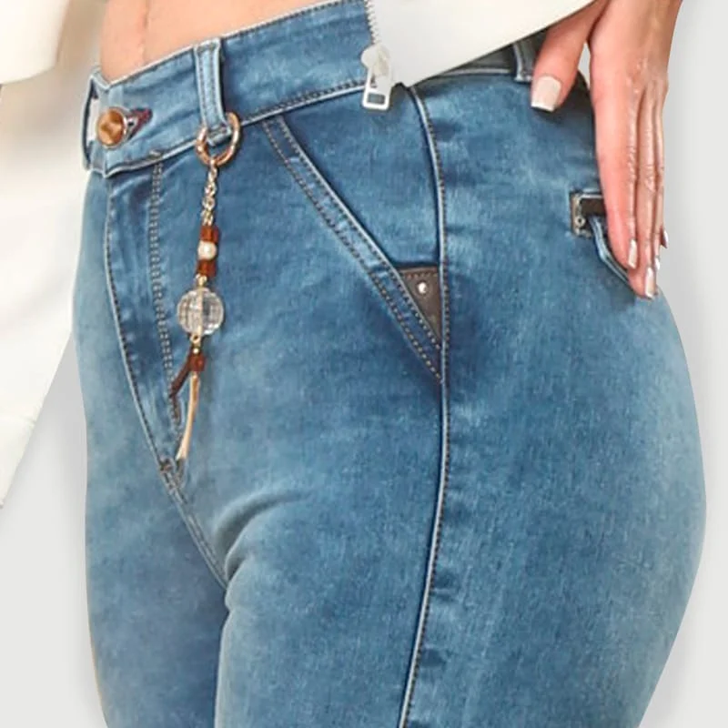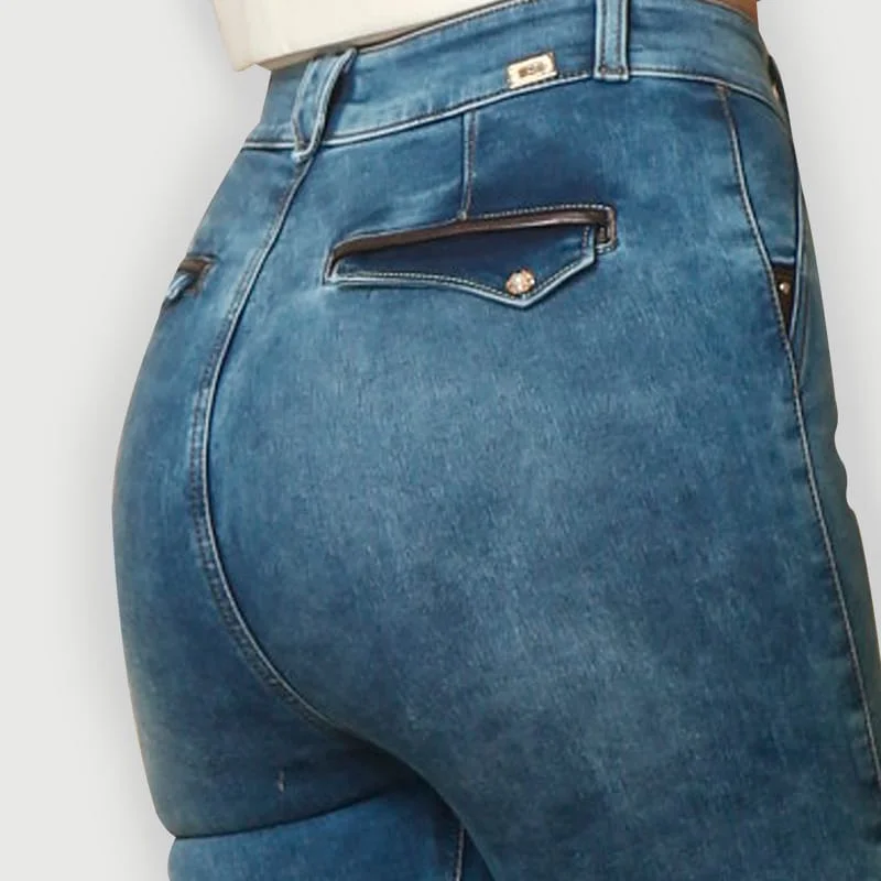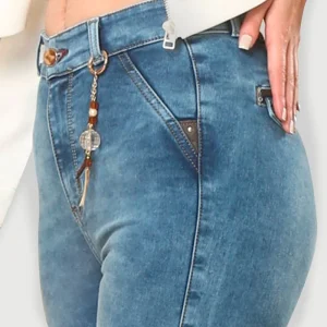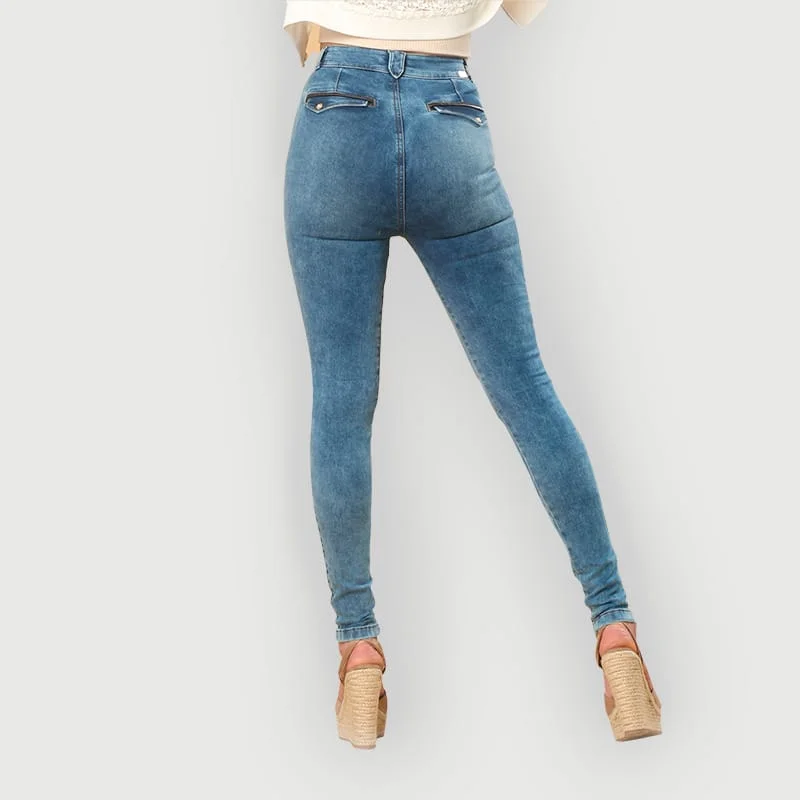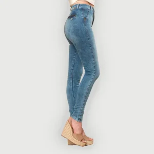 Jean skinny de tiro alto en tono azul acero con proceso medio de teñido froster. En su parte delantera presenta un detalle de mosquetón en piedras sintéticas y material metálico, así como bolsillos no funcionales con vivo triangular en cuero sintético. En su parte trasera cuenta con bolsillos de ribete y tapa con vivo en cuero sintético y botón en piedra sintética. Un denim de nuestra colección ‘Natural Connection’ para impactar en cualquier City.