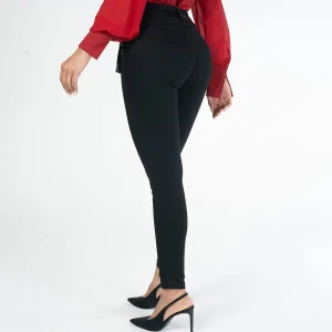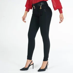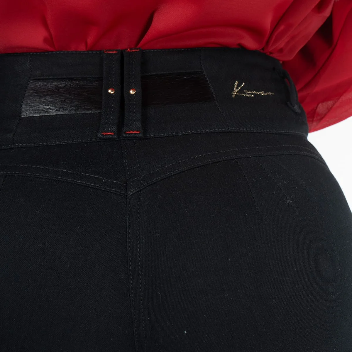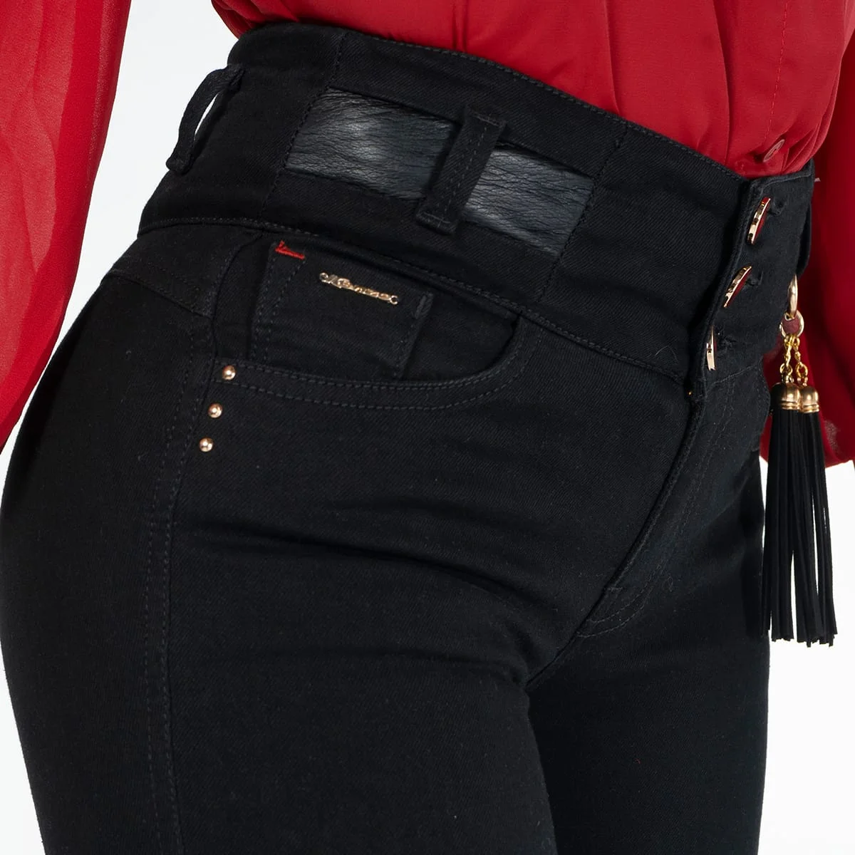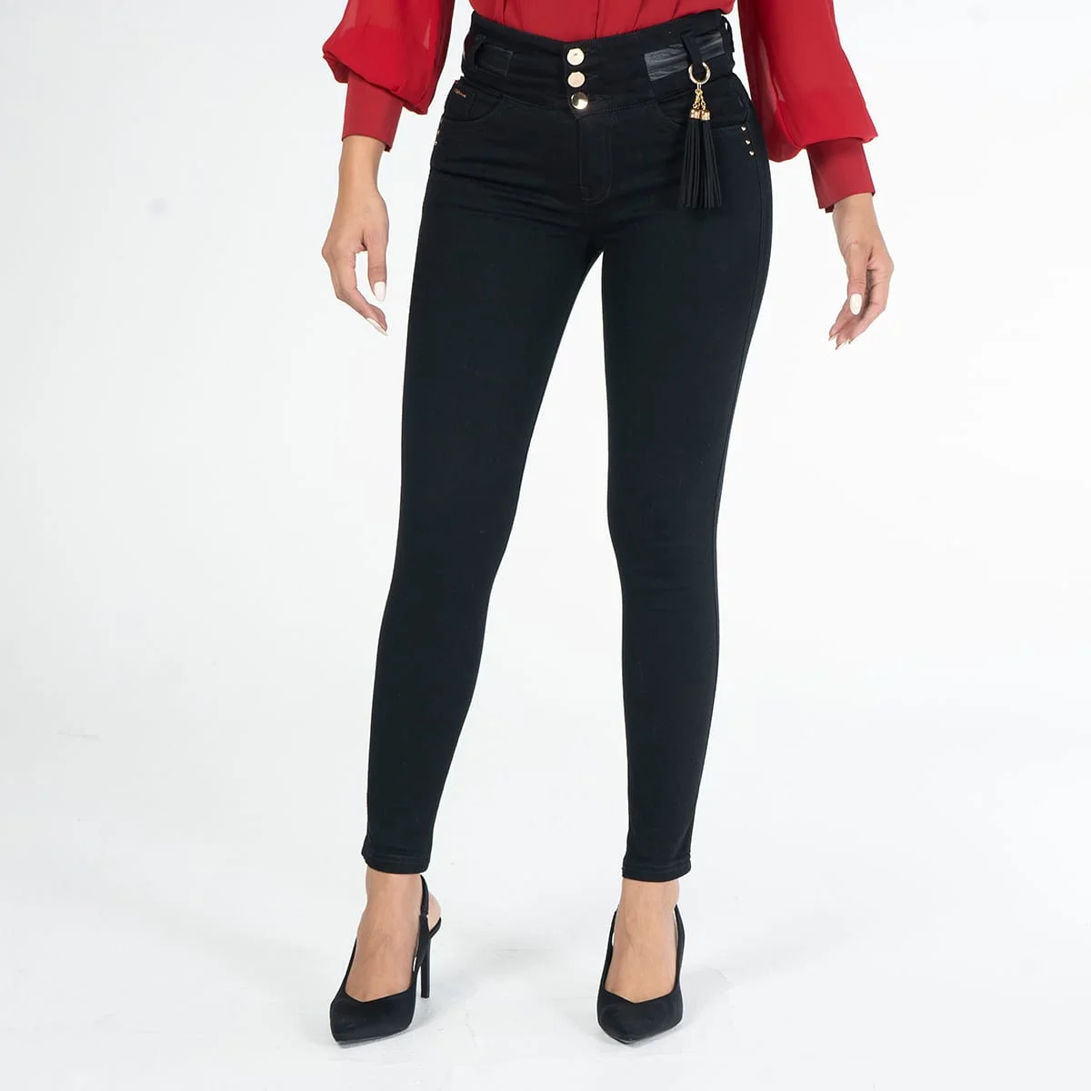 Pantalón Miss Eight en denim, silueta skinny, cuenta con pretina de tres botones con detalle de cortes en sintetico en costados y centro atras adicional de bordado emn la parte posterior. En la parte frontal cuenta con bolsillos redondos y relojero, su parte posterior tiene pinzas de realce. Esta prenda NO incluye accesorio.