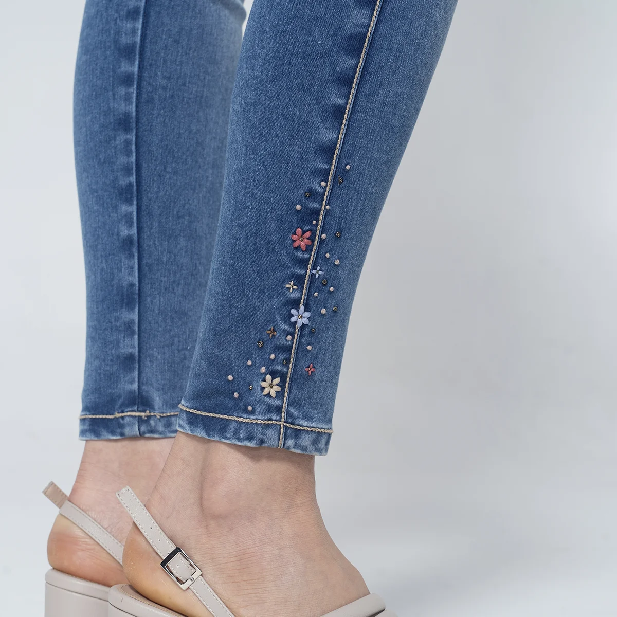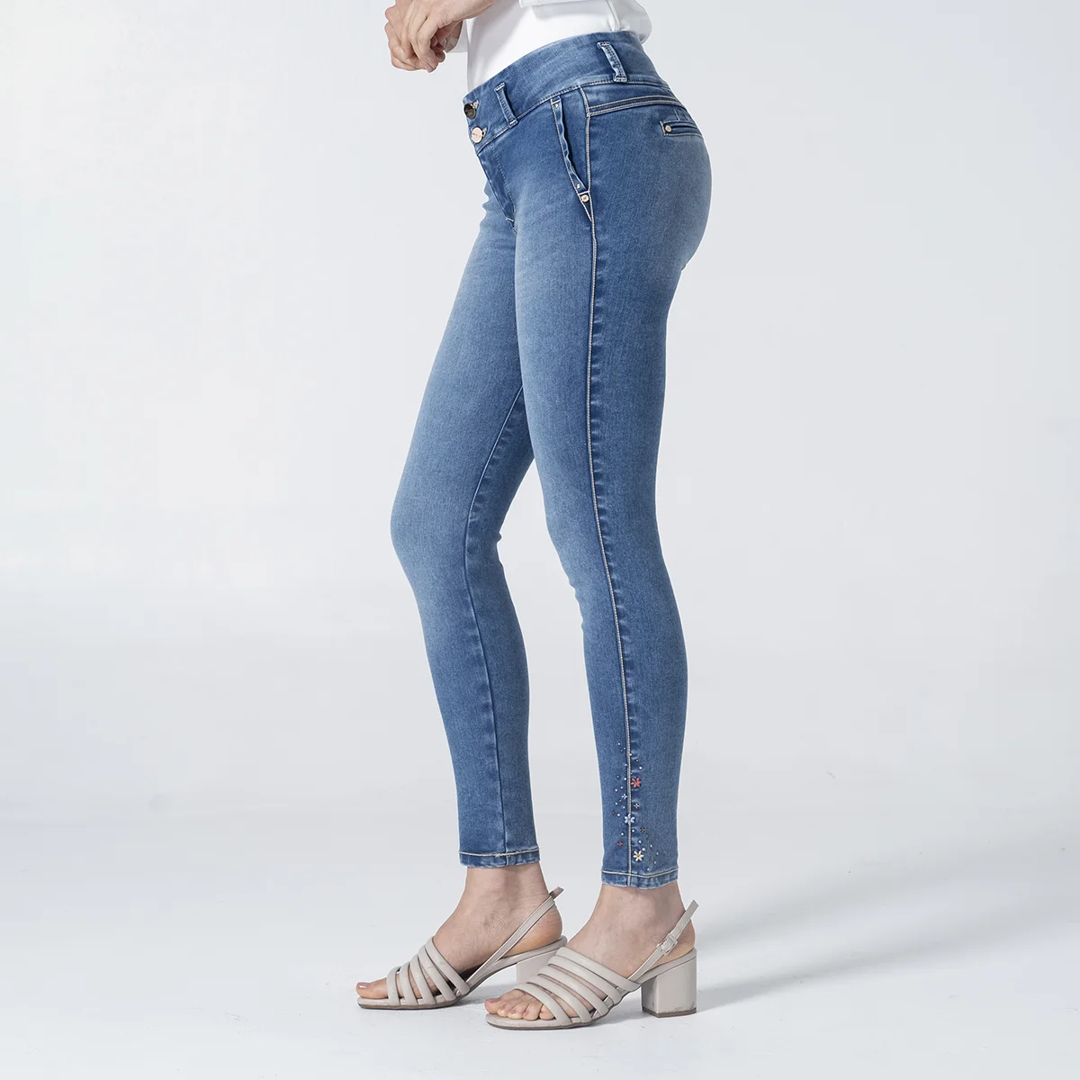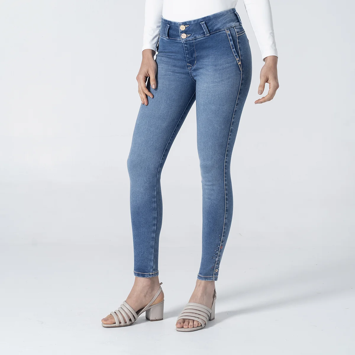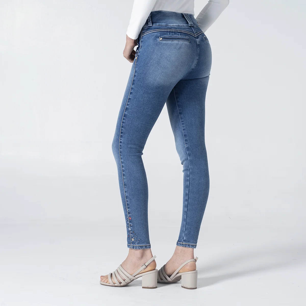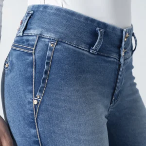 pantalón Evelyn en denim, una prenda diseñada con silueta skinny y efecto push-up que realza tus curvas de forma natural y sofisticada, Este jean para mujer destaca por su pretina de dos botones y exclusivos detalles bordados tanto en la parte posterior como en el costado de la bota, aportando un toque artesanal y único a tu look. Su diseño funcional incluye una simulación de bolsillos diagonales en el delantero y bolsillos tipo ribete en la parte trasera, logrando una estética limpia y moderna sin volumen extra. Confeccionado con materiales que garantizan un ajuste perfecto y duradero, este pantalón de mezclilla para mujer es el aliado ideal para quienes buscan comodidad, tendencia y una figura impecable en cualquier ocasión.