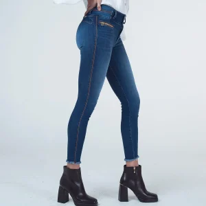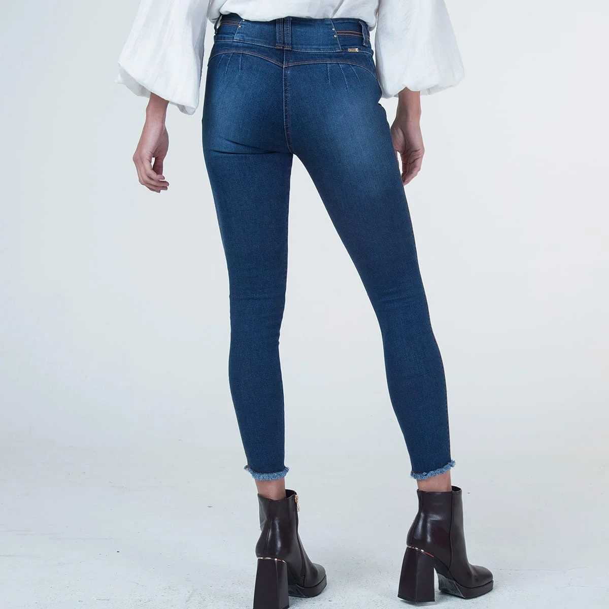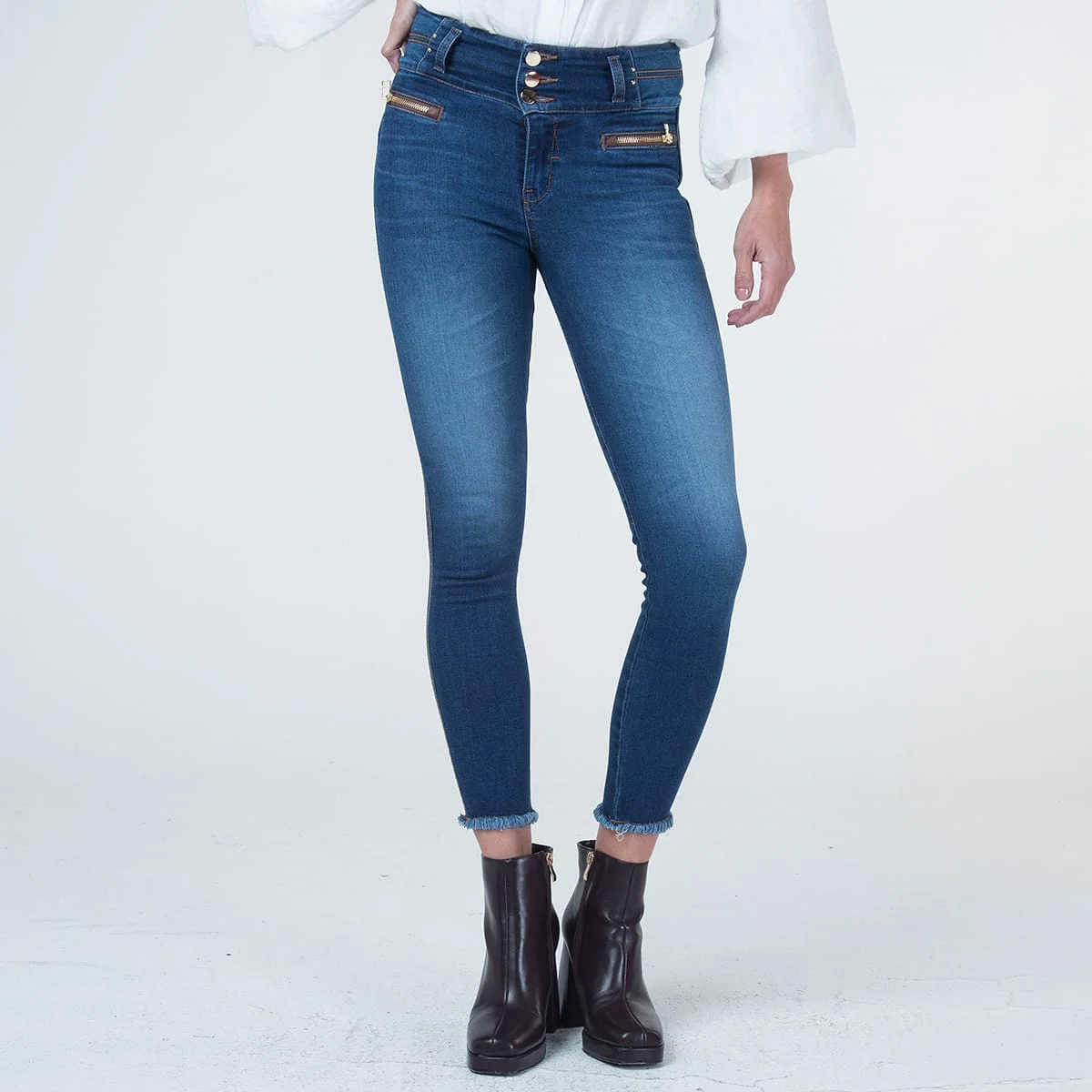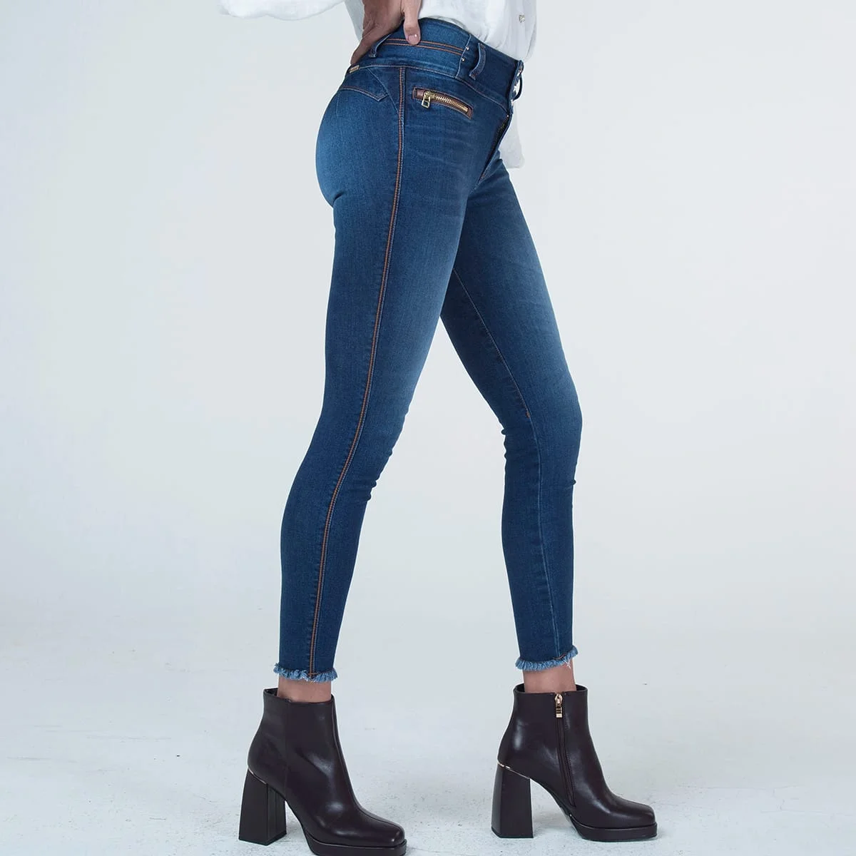 Pantalón Riri en denim perfecta para destacar en cualquier ocasión. Cuenta con pretina de tres botones con detalle de costura decorativa a los costados, jean para mujer silueta skinny que resalta la figura femenina de manera elegante. En su parte frontal cuenta con cremalleras decorativas como imitación de bolsillo. su parte posterior tiene cotillas sobrepuestas pinzas de realce, bota terminada con orillo suelto y desflecado.