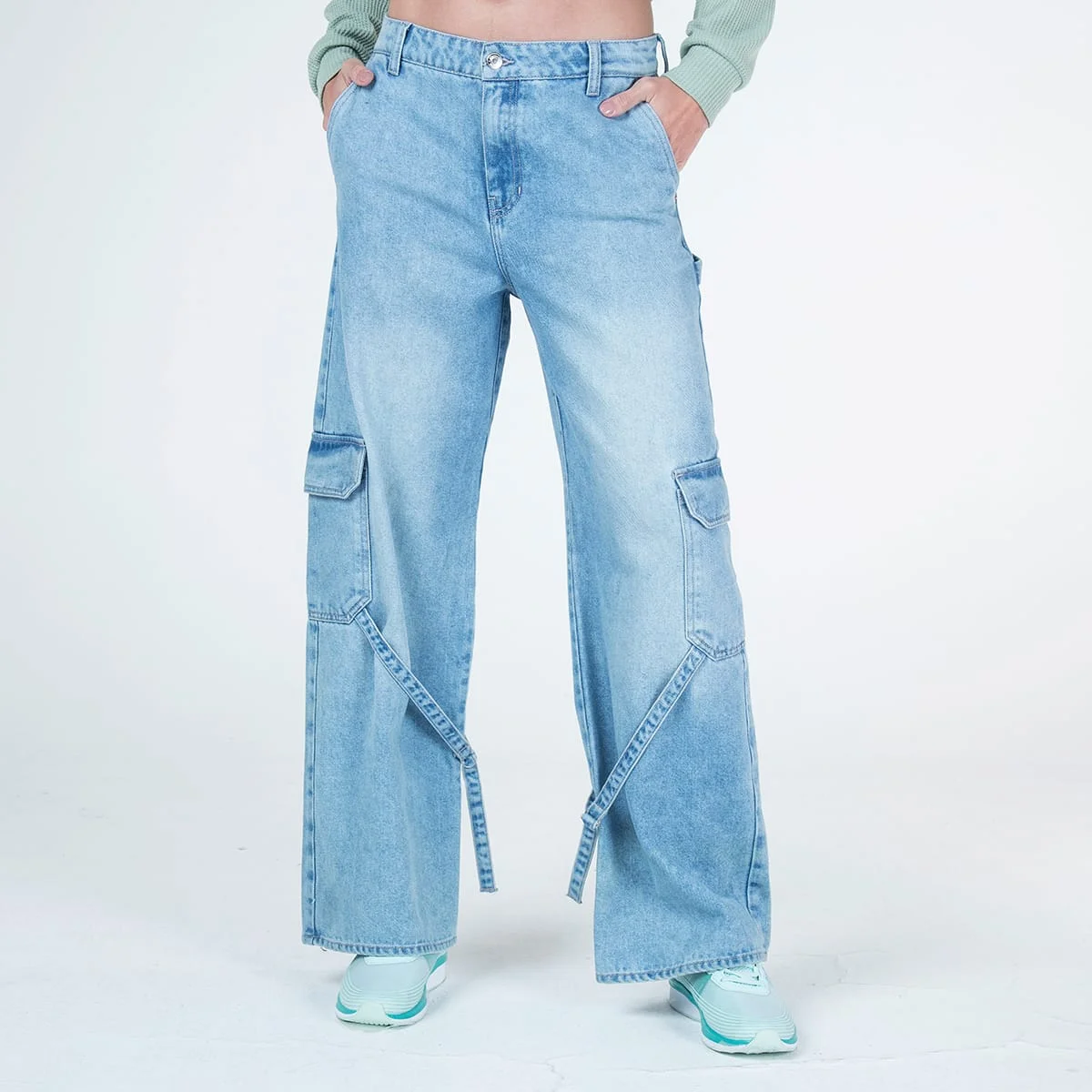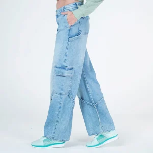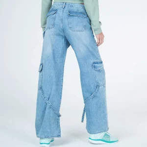 Jean 999 silueta wide leg tipo cargo perfecto para un look casual, con pretina de un solo botón dando un ajuste perfecto a la cintura, en su parte frontal cuenta con bolsillos laterales, en su parte posterior cuenta con bolsillos tipo parche con cierre de tapa, en la altura de la rodilla en los laterales cuenta con bolsillos tipo cargo que le dan un toque urbano con charretera decorativa, Este pantalón en denim con tendencia cargo y en su version carpintera es ideal para crear looks versátiles y estar en tendencia para cualquier ocasión.