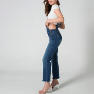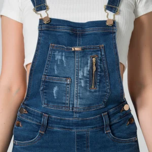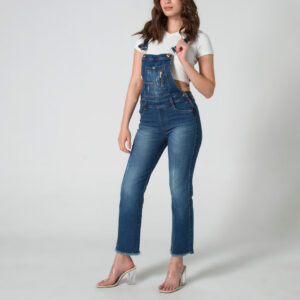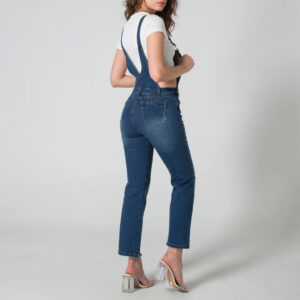 En la parte delantera inferior, presenta bolsillos redondos que añaden un toque casual y funcional al diseño. La parte posterior del overol cuenta con pinzas de realce que brindan una excelente forma y un ajuste cómodo. Además, incluye bolsillos tipo parche, perfectos para un toque adicional de estilo.