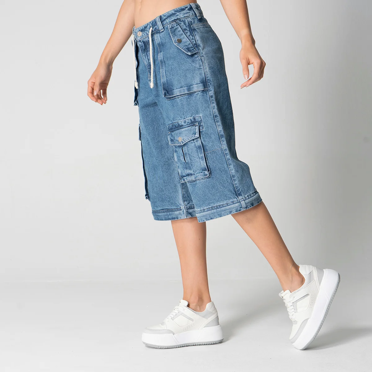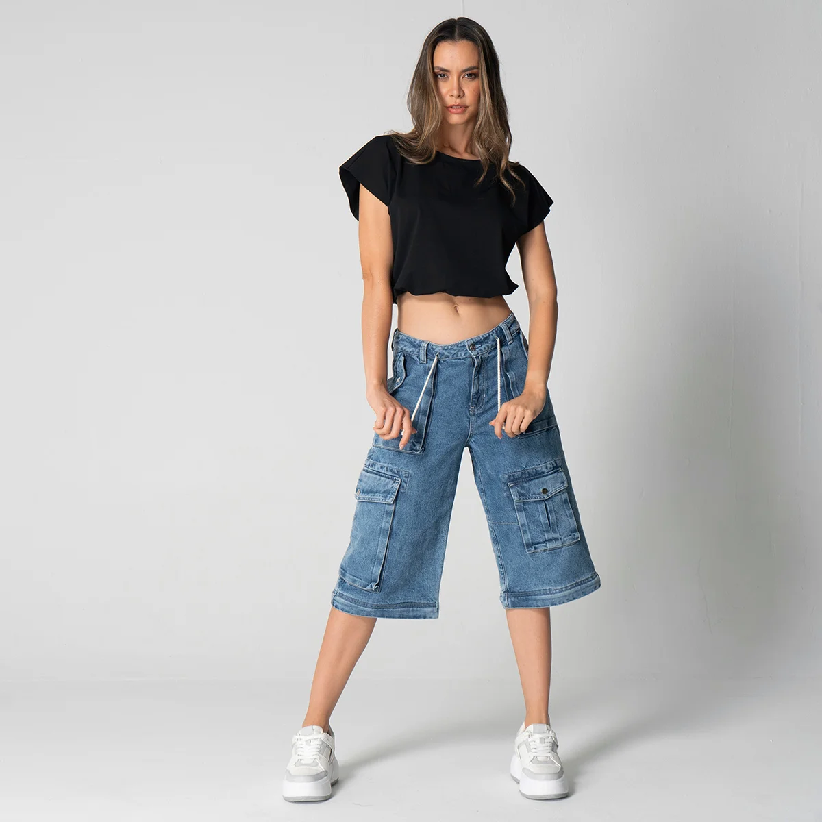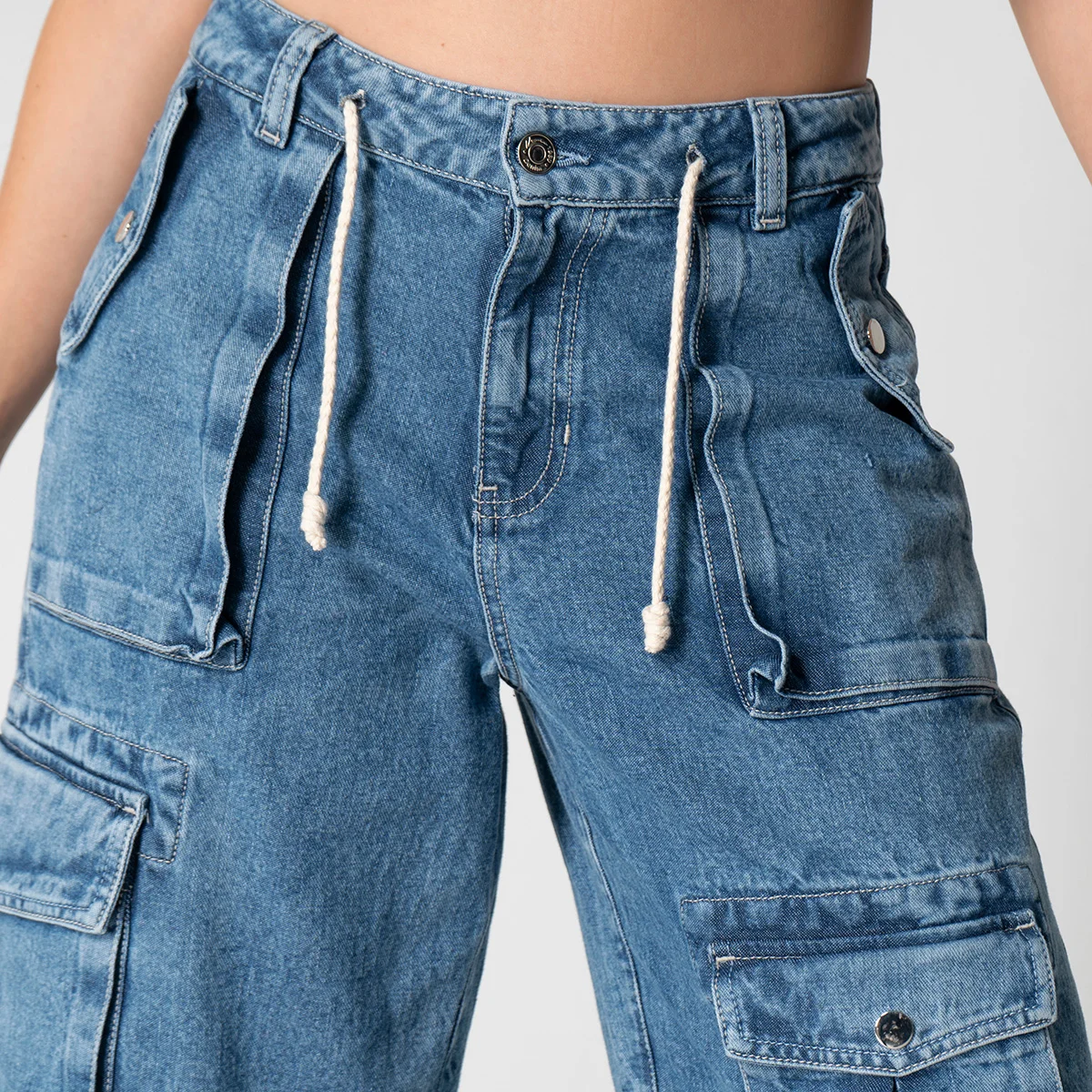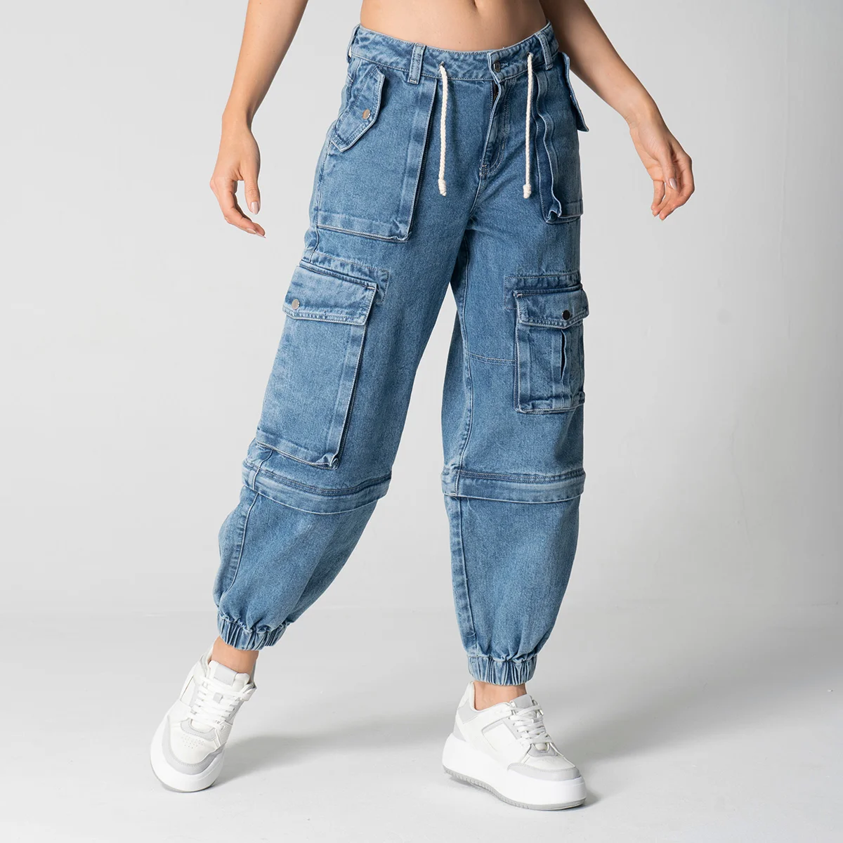 Pantalón Cargo en Denim, diseñado para aquellos que buscan comodidad sin sacrificar la moda. Este pantalón cuenta con una pretina ajustable con un botón y cordón, permitiendo un ajuste personalizado para cada figura. La cremallera frontal asegura un cierre seguro y práctico. En la parte delantera, encontrarás bolsillos con tapa y cierre de broche, ideales para mantener tus pertenencias organizadas y al alcance de la mano. Su diseño cargo no solo es funcional, sino que también aporta un toque distintivo a tu atuendo.