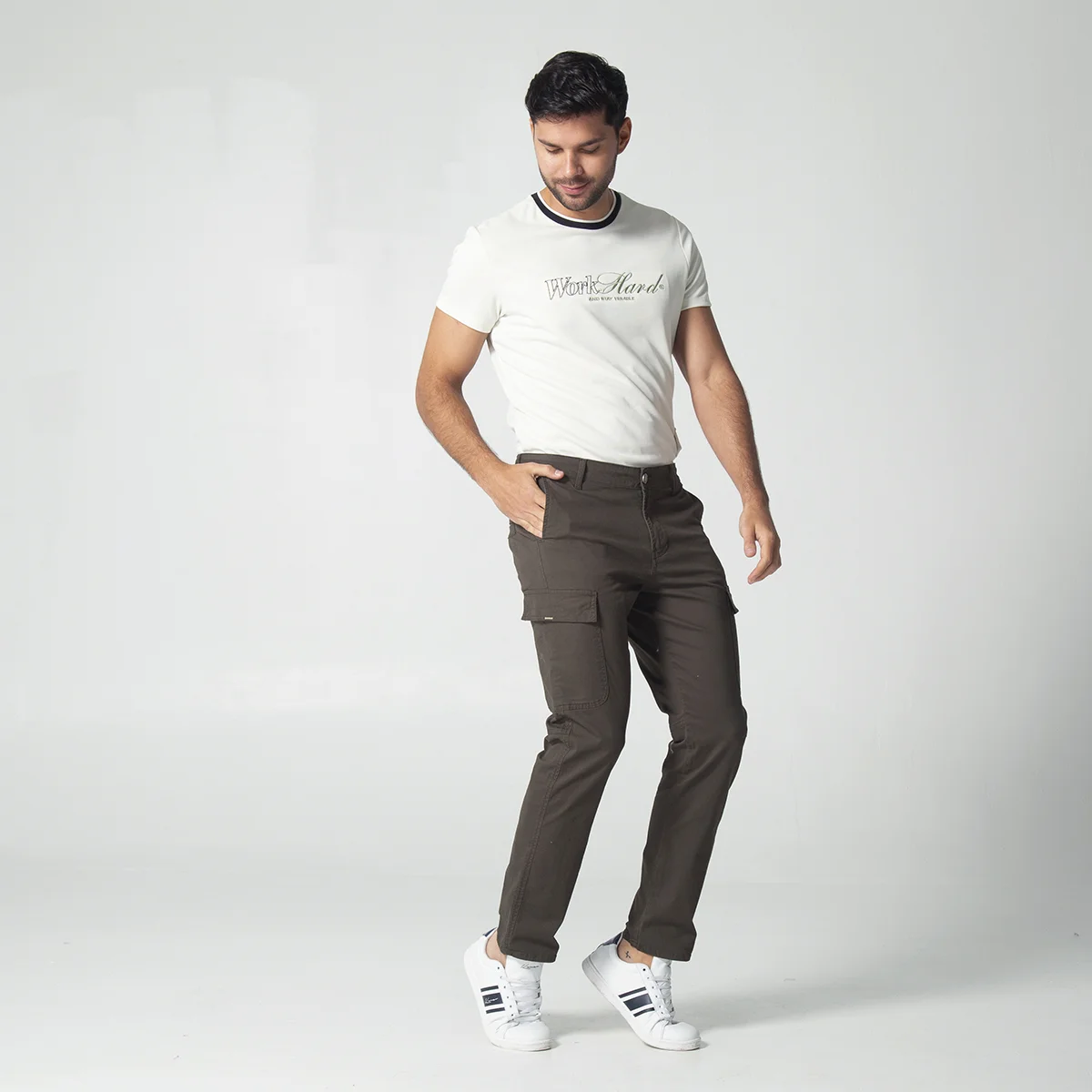 Pantalón Native en drill, diseñado para comodidad y estilo. Cuenta con una pretina de un botón y cierre de cremallera en la parte frontal para un ajuste seguro. Cuenta con bolsillos diagonales en los laterales, bolsillos tipo cargo con tapa y cierre en los costados, ideales para objetos pequeños, Además en la parte posterior tiene bolsillos tipo ribete que aportan un toque práctico y estilizado. Este pantalón para hombre es perfecto para un look casual y funcional.