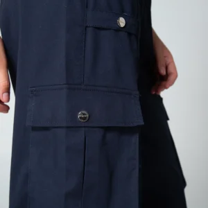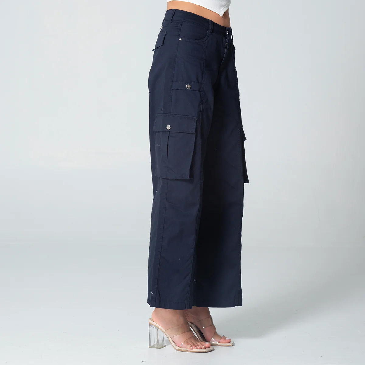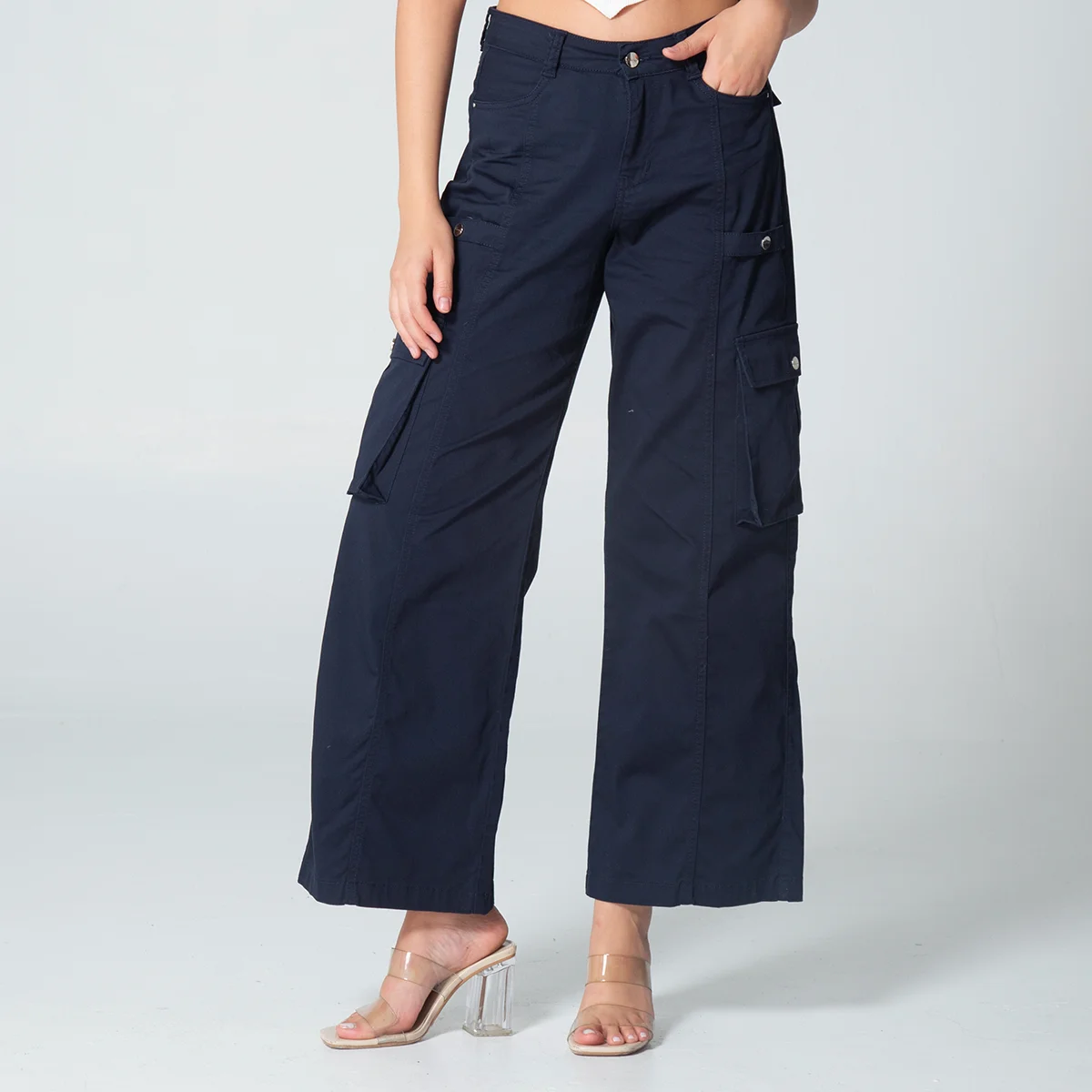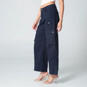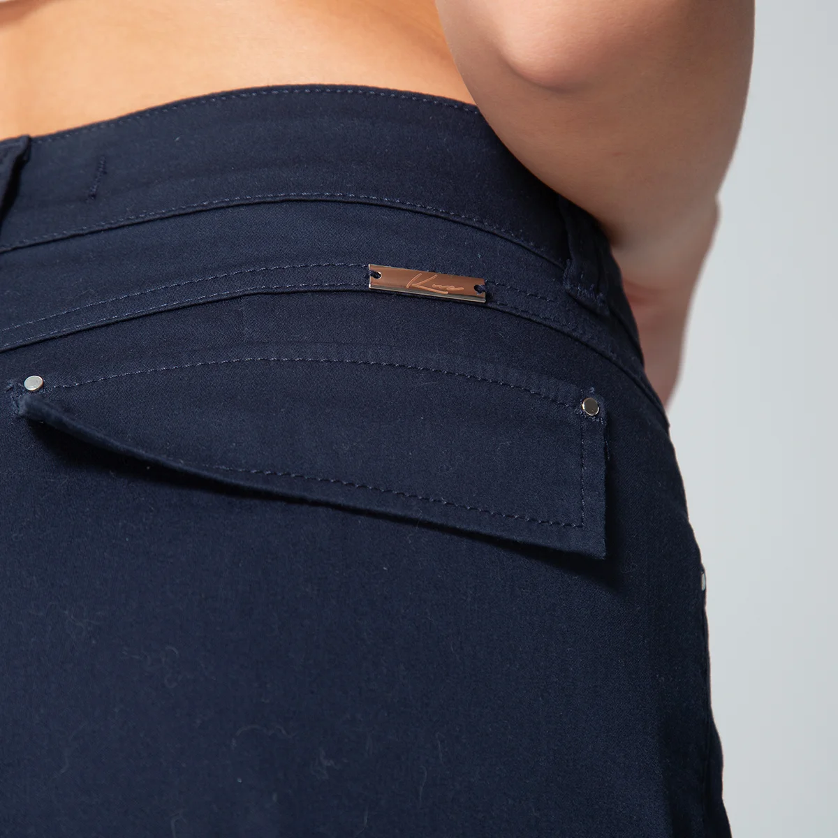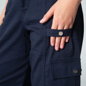 En el delantero combina bolsillos redondos funcionales con bolsillos tipo cargo en el costado, proporcionando practicidad y un toque moderno, la parte posterior mantiene una estética limpia, incorporando tapas de simulación de bolsillo que definen la silueta sin añadir volumen.