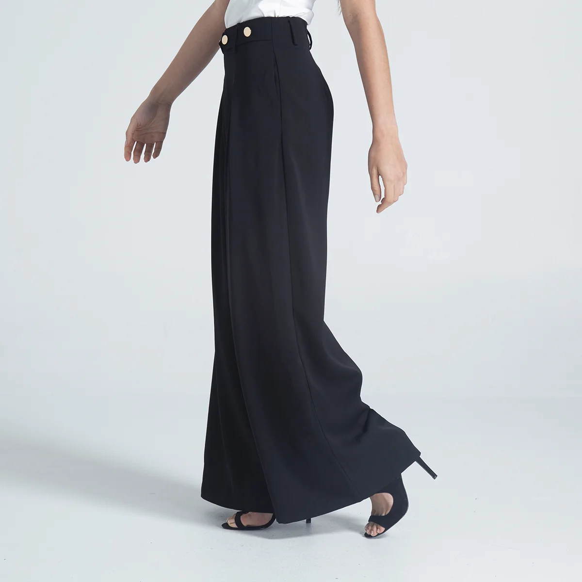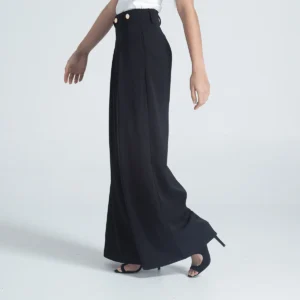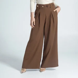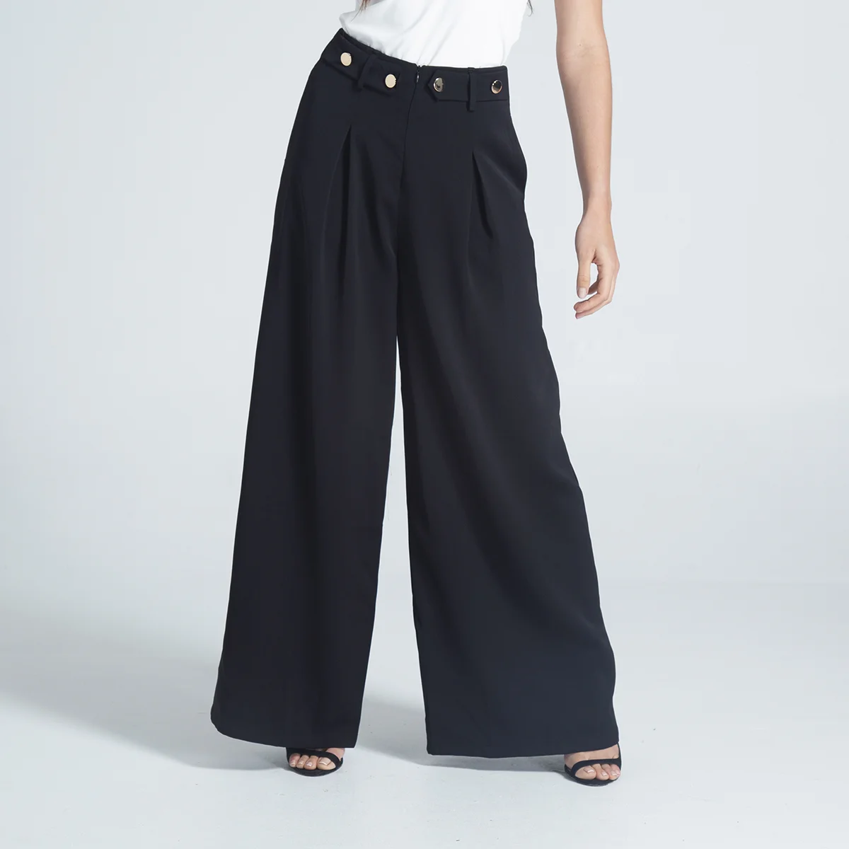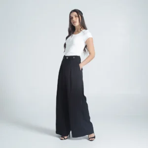 nuestro pantalón Naiya silueta amplia, una prenda sofisticada que combina la elegancia de la sastrería clásica con detalles modernos de alta tendencia. Este diseño destaca por su pretina de tiro alto decorada con botones dorados de gran formato que aportan un toque de brillo exclusivo, complementada con un sistema de cierre de cremallera frontal invisible y alforzas o prenses que añaden volumen estructurado y fluidez al caminar. Confeccionado en un textil de caída impecable, este pantalón para mujer es el aliado perfecto para crear looks de moda femenina versátiles, ideales tanto para la oficina como para eventos formales donde la comodidad y el buen gusto son prioridad.