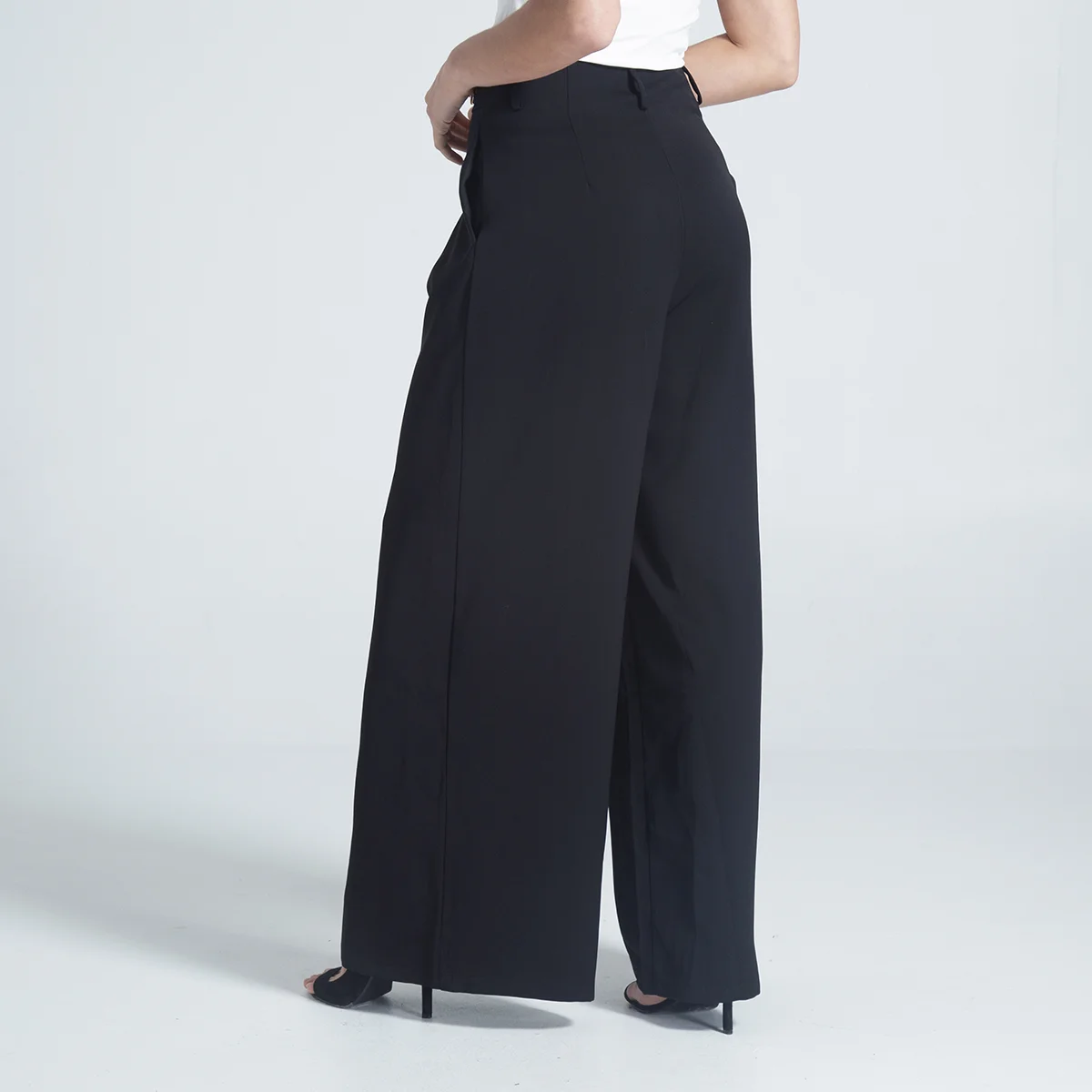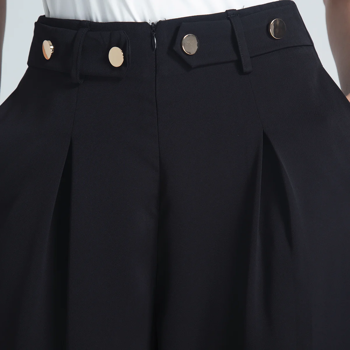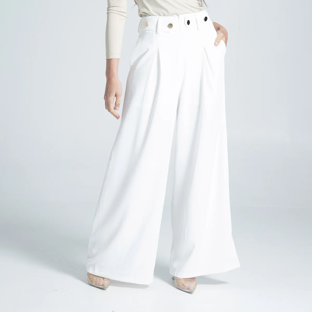 nuestro pantalón Naiya silueta amplia, una prenda sofisticada que combina la elegancia de la sastrería clásica con detalles modernos de alta tendencia. Este diseño destaca por su pretina de tiro alto decorada con botones dorados de gran formato que aportan un toque de brillo exclusivo, complementada con un sistema de cierre de cremallera frontal invisible y alforzas o prenses que añaden volumen estructurado y fluidez al caminar. Confeccionado en un textil de caída impecable, este pantalón para mujer es el aliado perfecto para crear looks de moda femenina versátiles, ideales tanto para la oficina como para eventos formales donde la comodidad y el buen gusto son prioridad.