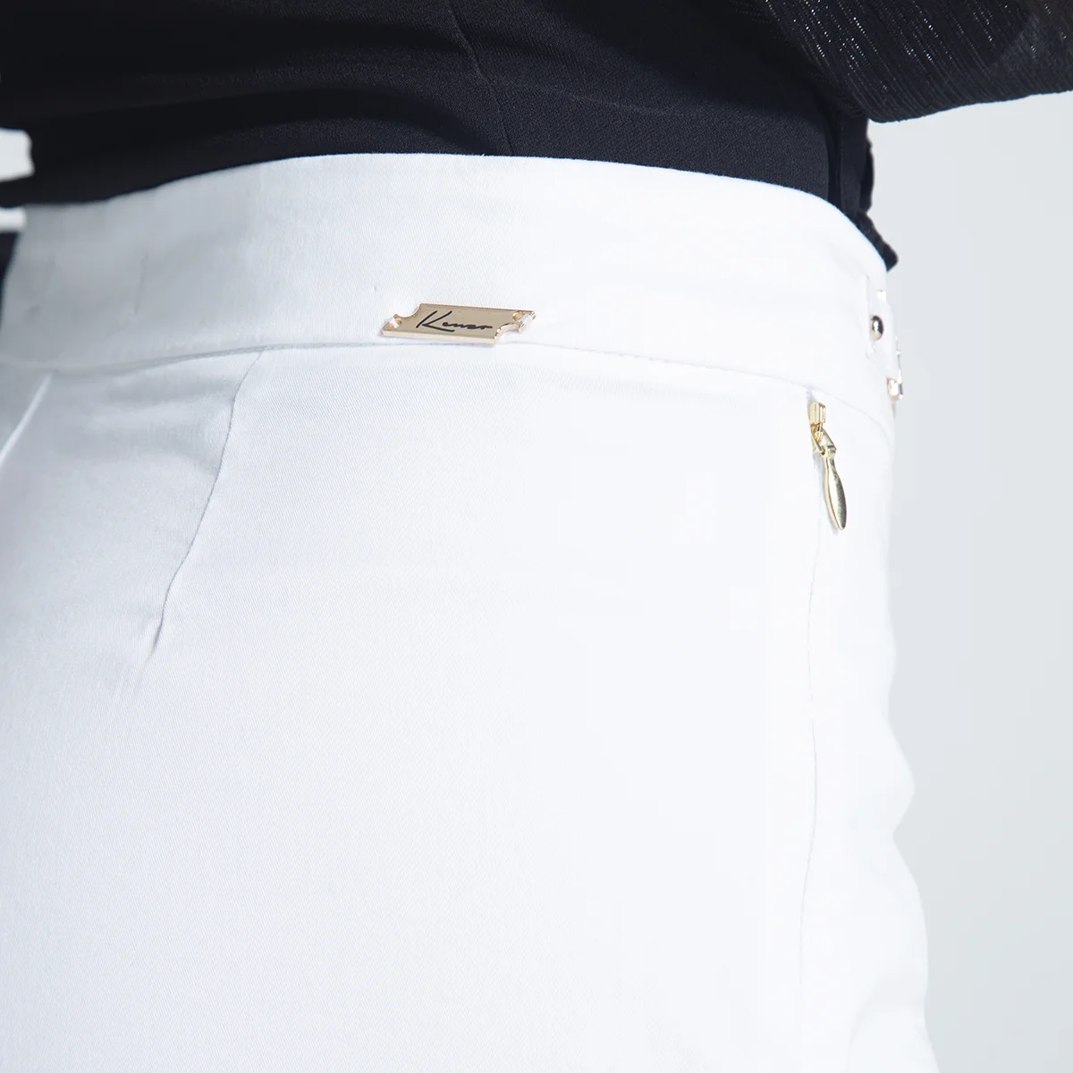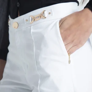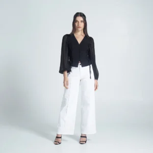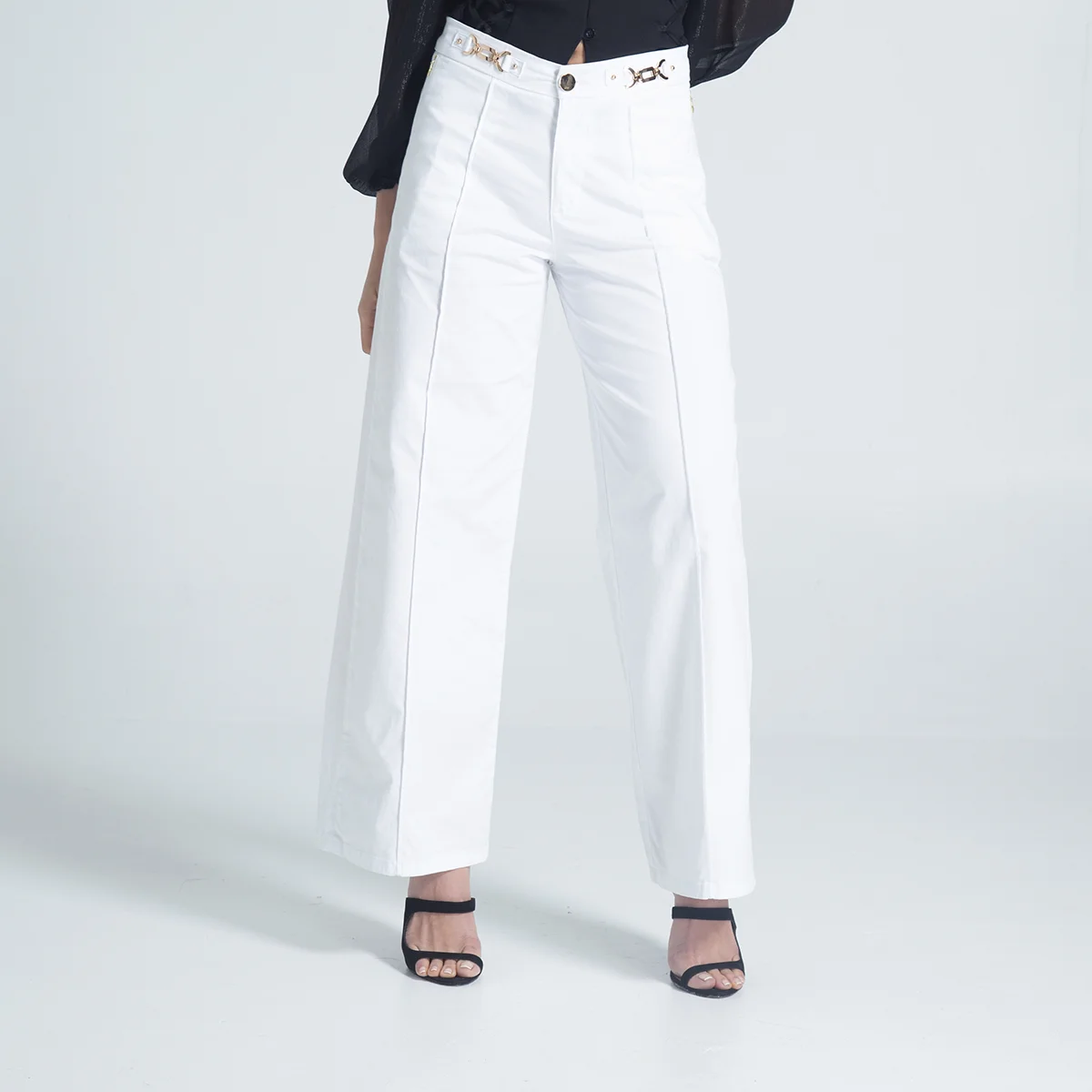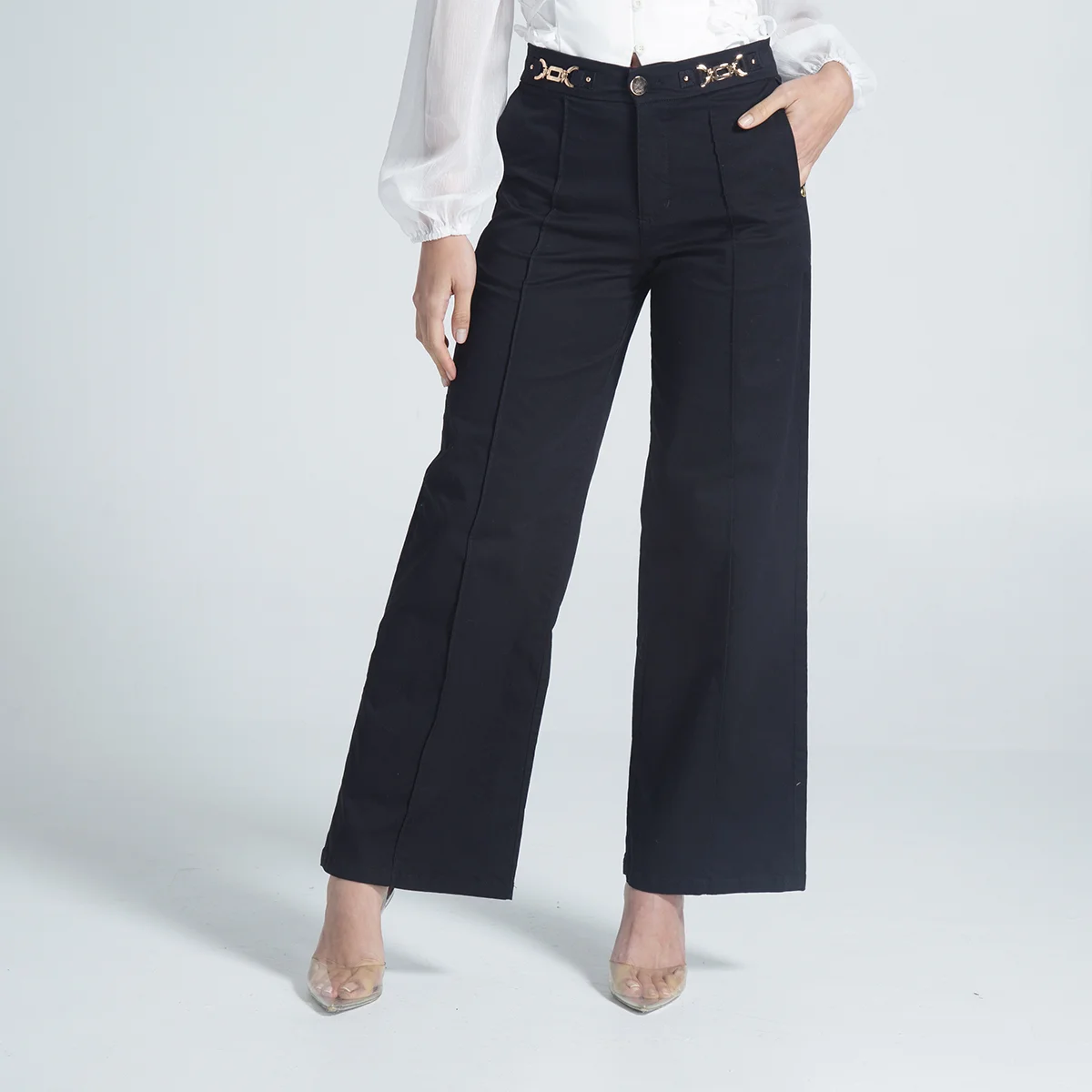 Eleva tu estilo con el pantalón Caprin silueta wide leg, una prenda diseñada para fusionar sofisticación y modernidad en un solo diseño, Este pantalón destaca por su pretina tipo sastre con cierre de un solo botón y exclusivos detalles de herrajes que aportan un toque de elegancia superior mientras que la alforza frontal y los funcionales bolsillos laterales con cierre de cremallera definen una estética pulida y contemporánea.