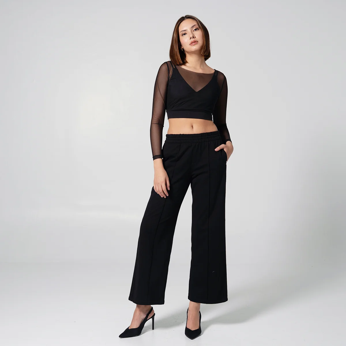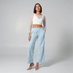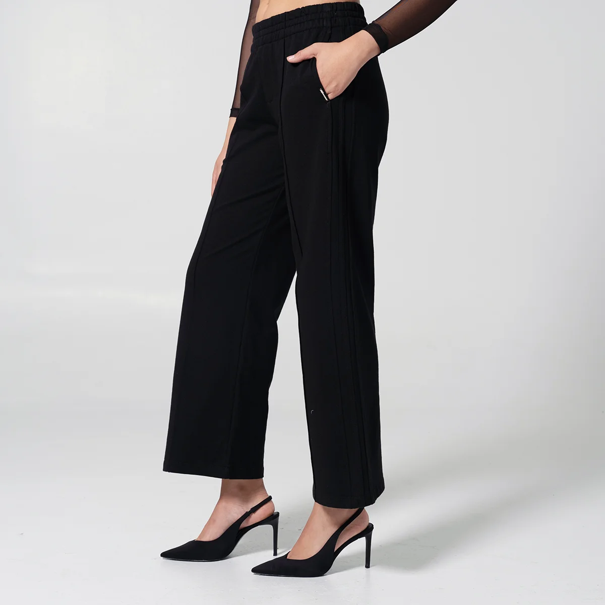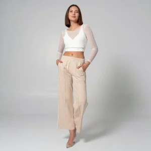 Pantalón Drake es una prenda moderna que define la silueta con su tendencia wide leg de pierna ancha, priorizando la comodidad gracias a su pretina con elástico, su diseño se distingue por un elegante detalle de alforza en la parte frontal, que ayuda a estilizar.