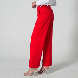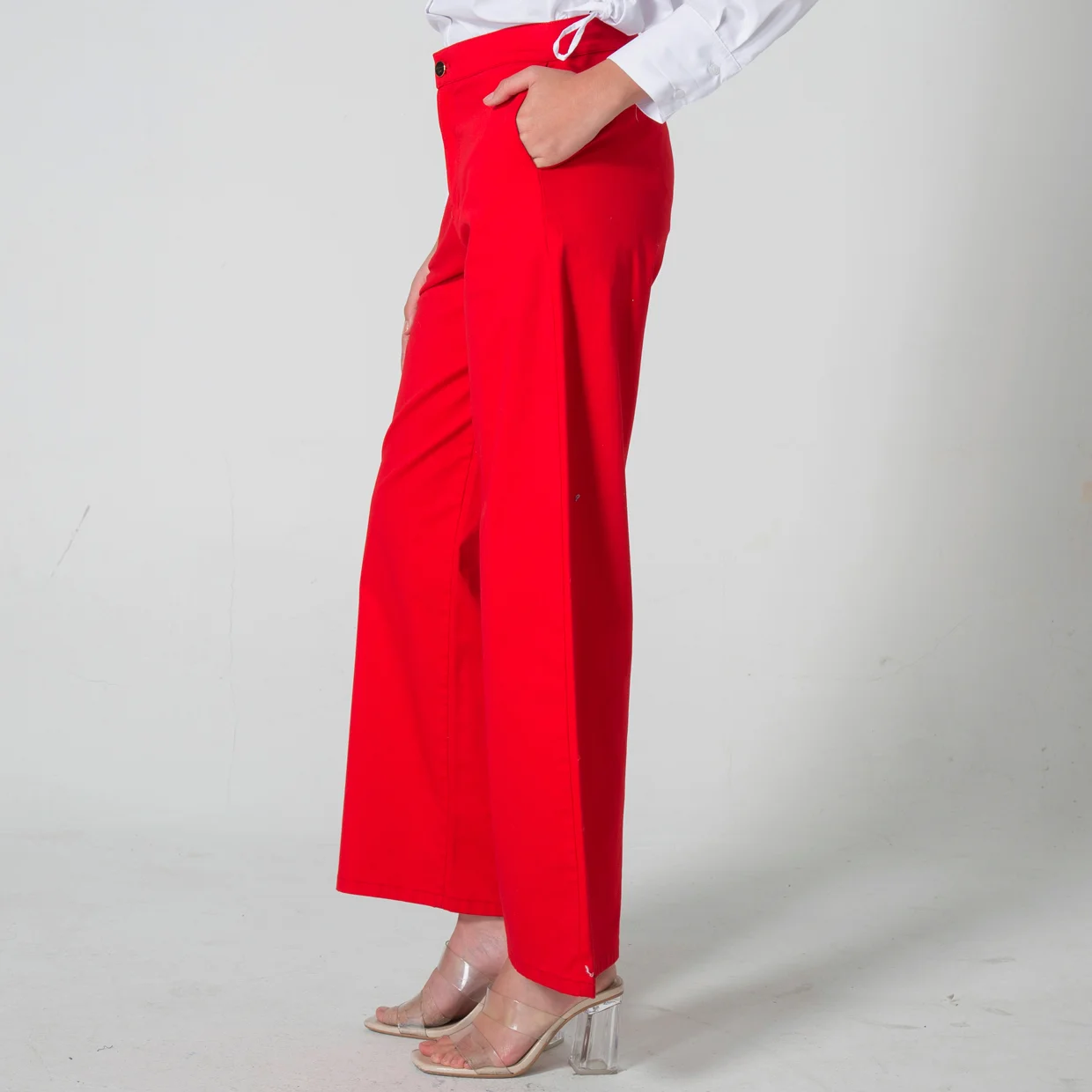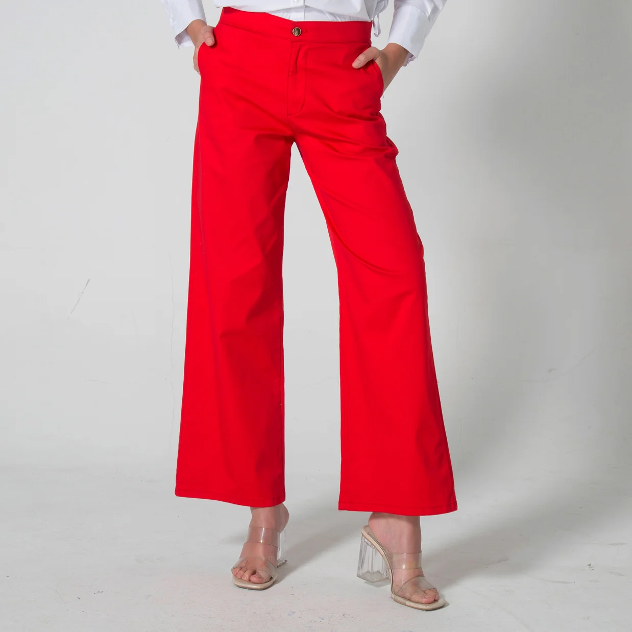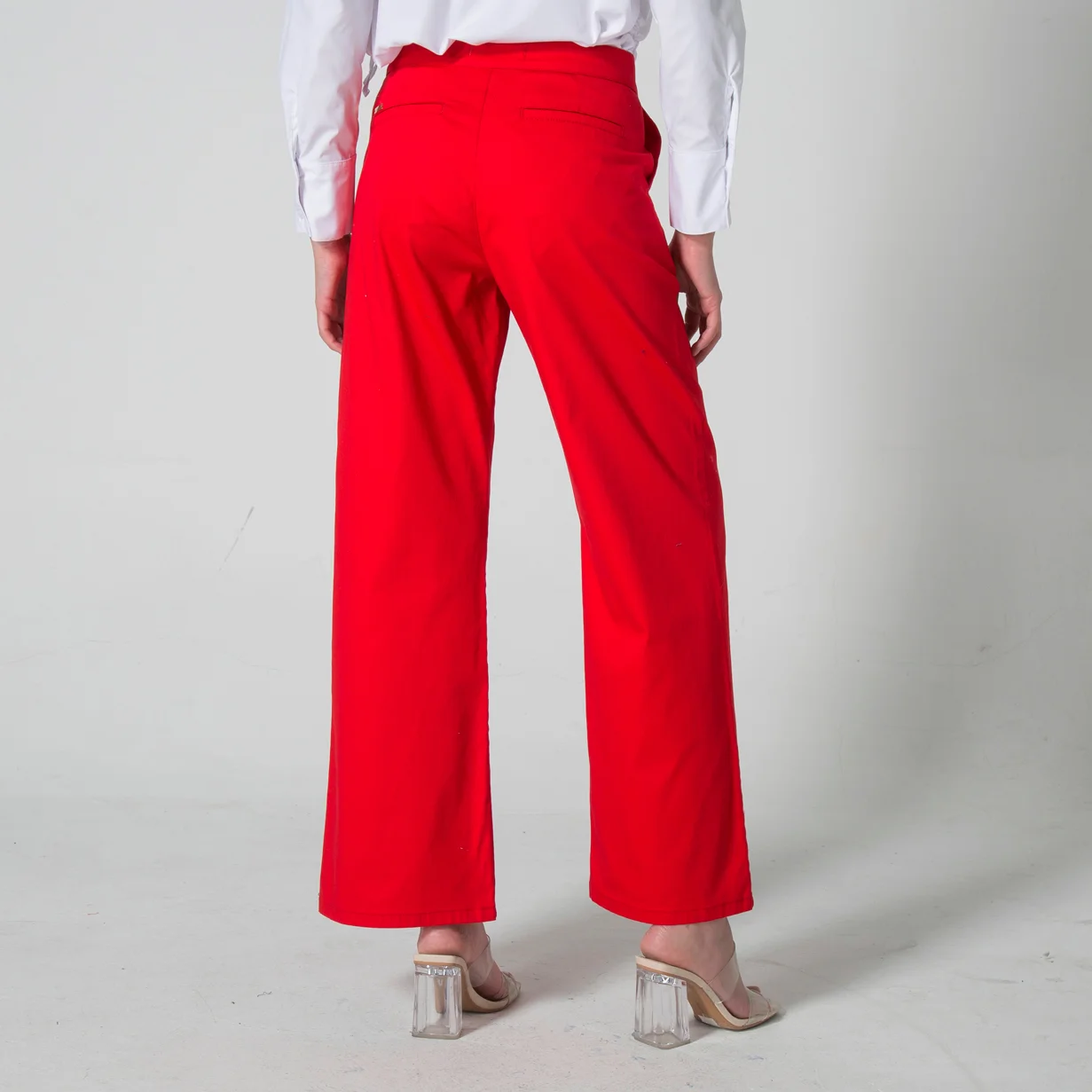 Pantalón escarlata que combina estilo y comodidad gracias a su silueta wide leg. Su diseño incluye una pretina con un solo botón y un práctico cierre de cremallera, lo que asegura un ajuste perfecto y fácil de poner.