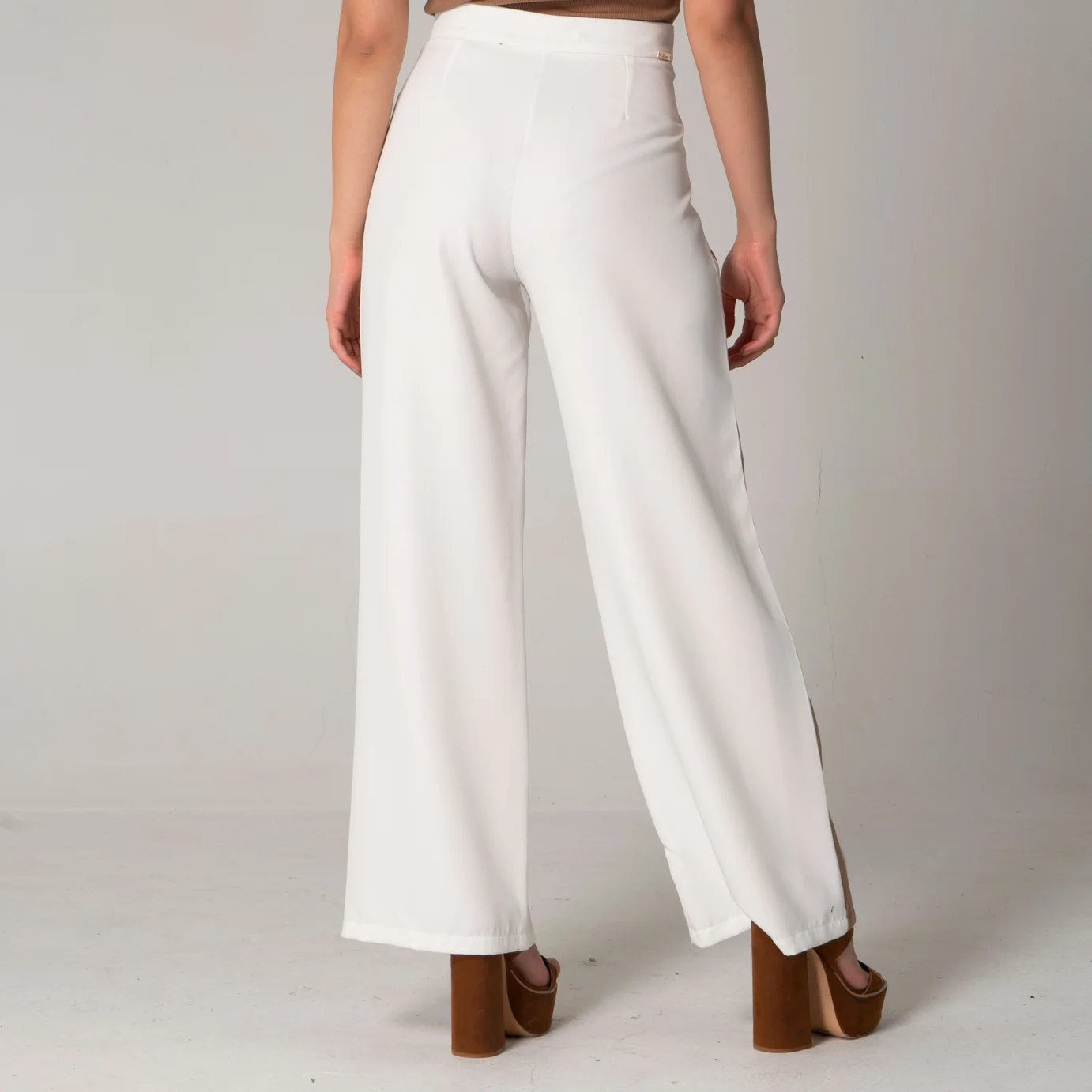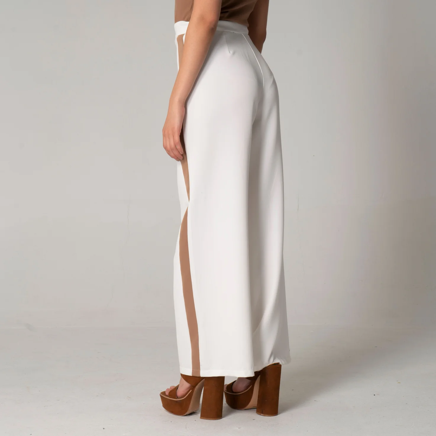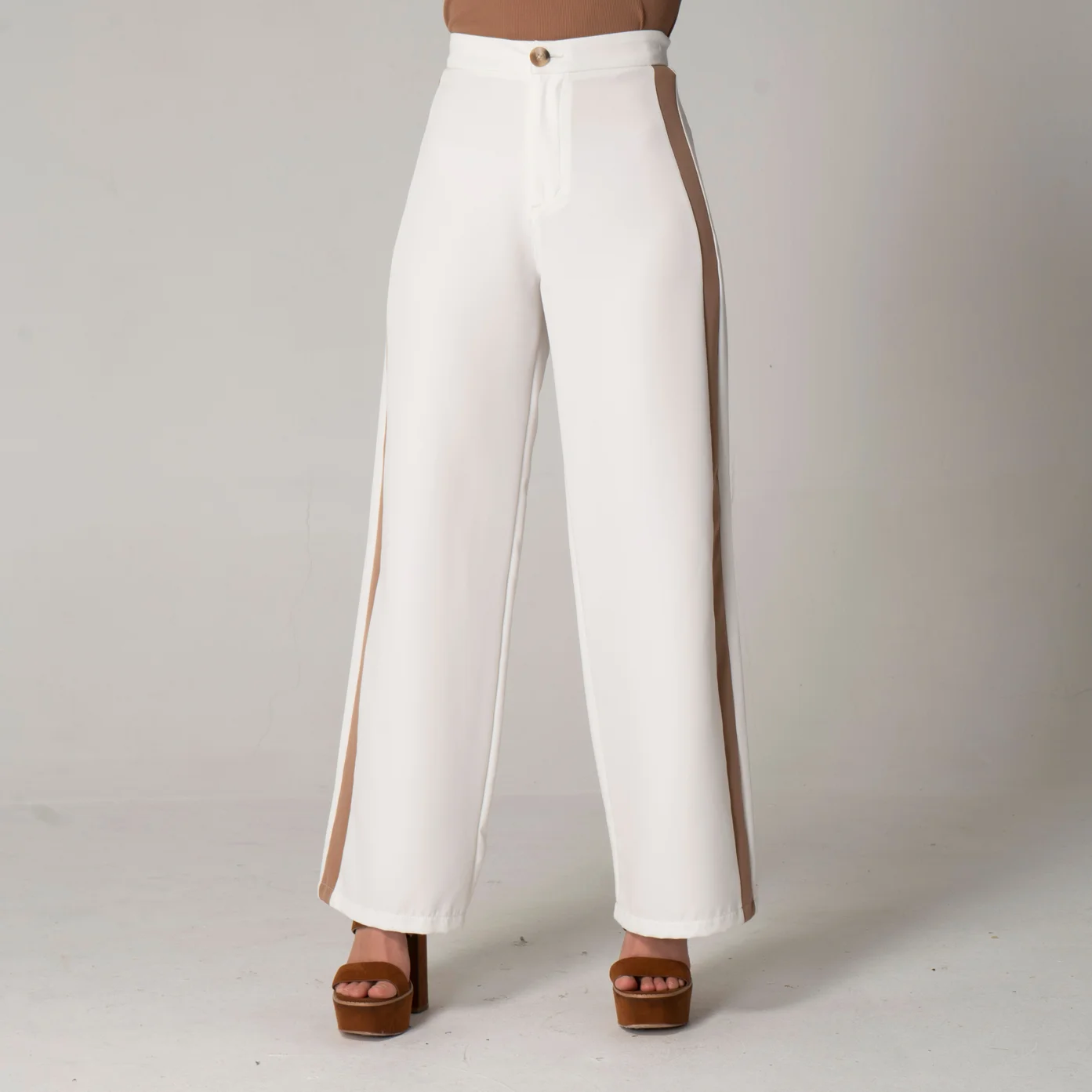 En la parte frontal, destaca por sus cortes en contraste en los costados, que añaden un toque moderno y distintivo. Además, en la parte posterior, incorpora pinzas de realce que realzan la figura, proporcionando un fit adecuado y estilizado. Ideal para una variedad de ocasiones, este pantalón combina versatilidad y tendencia en cada paso.
