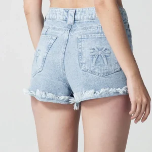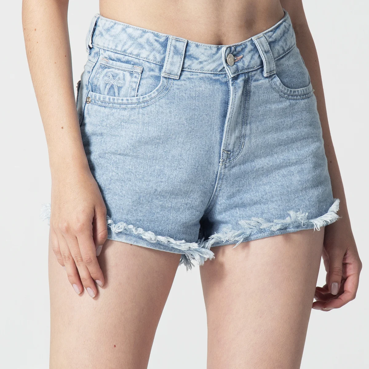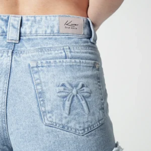 El short Gabriel en denim presenta una silueta regular que equilibra perfectamente la comodidad y el estilo casual, ideal para un look fresco y relajado, en su parte frontal, incluye bolsillos funcionales destacados por un relojero con un delicado bordado de moño, detalle femenino que se repite con elegancia en los dos bolsillos tipo parche de la parte posterior.