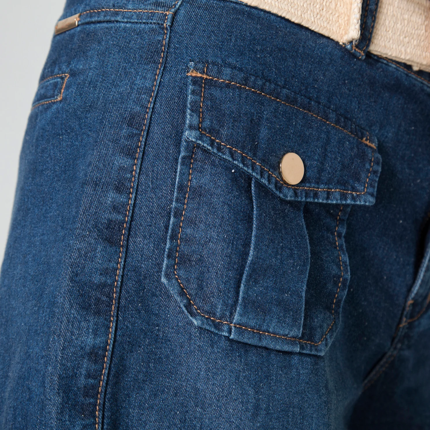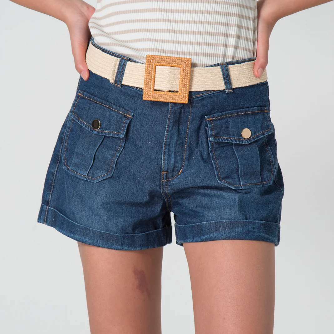 Short Ivana es un atractivo diseño en denim que combina estilo y funcionalidad. Presenta una pretina con un botón y un práctico cierre de cremallera. Al frente, se destacan sus bolsillos tipo parche con tapa y cierre de broche, que añaden un toque de originalidad. En la parte posterior, cuenta con una elegante imitación de bolsillo tipo ribete, lo que completa su look moderno y versátil. Ideal para lucir en diversas ocasiones.