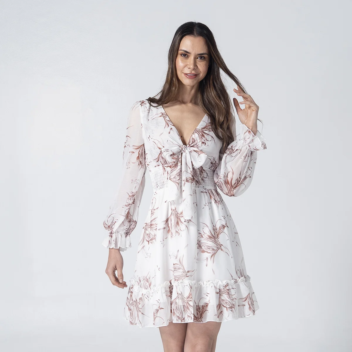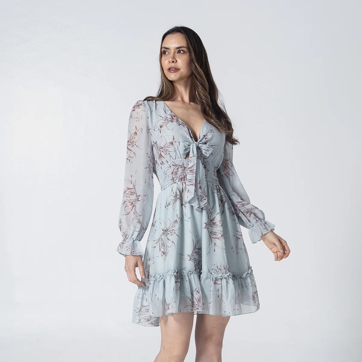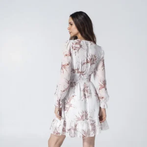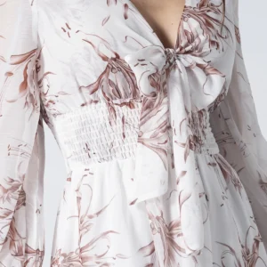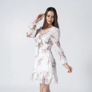 Sus mangas largas con puños elásticos y el ruedo con bolero aportan un movimiento fluido y elegante, convirtiéndolo en la opción ideal de moda femenina para eventos de día, salidas casuales o una tarde especial. Confeccionado en una tela liviana de alta calidad, este vestido es una pieza versátil que combina perfectamente con sandalias o botines para un look de temporada impecable.