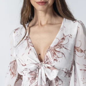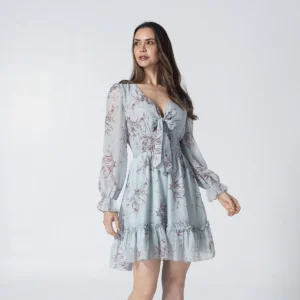 Captura la esencia de la feminidad con nuestro vestido corto Beauty, una prenda encantadora diseñada con un delicado estampado de flores que evoca frescura y romanticismo. Este diseño destaca por su favorecedor escote en V con un detalle de lazo frontal ajustable que crea una sutil abertura tipo cut-out, complementado por una cintura encauchada que define la silueta con total comodidad.