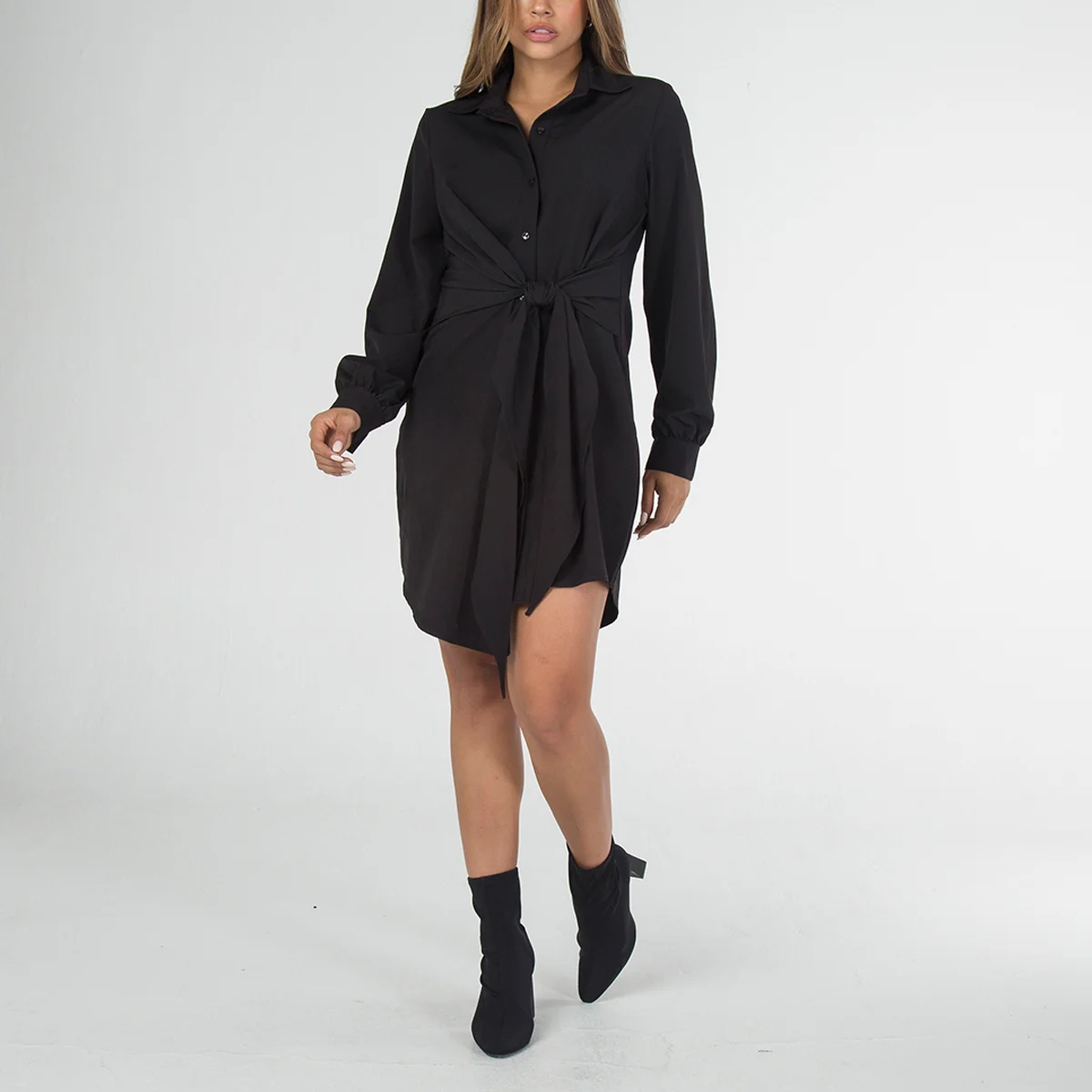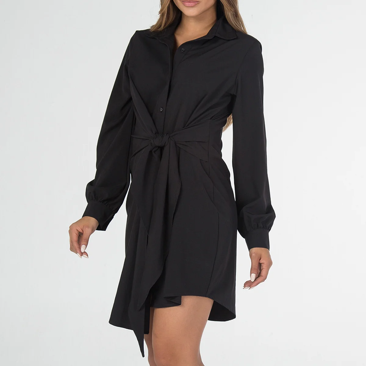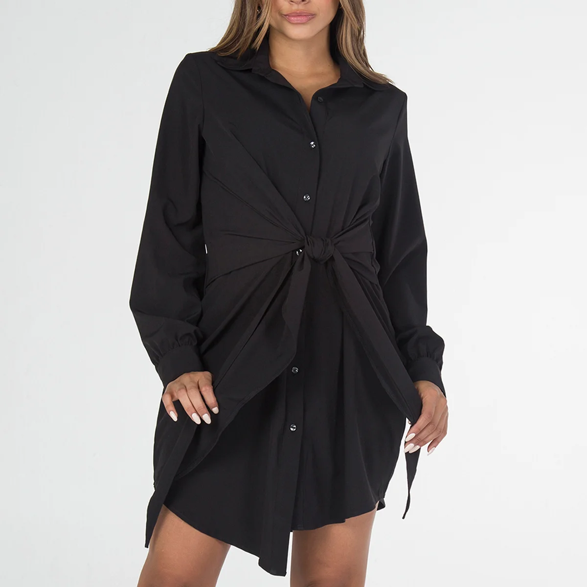 Vestido drapeado Cosmic con cuello solapa. Manga larga terminada con puño de cierre de botón. Su sistema de cierre es de botonadura.