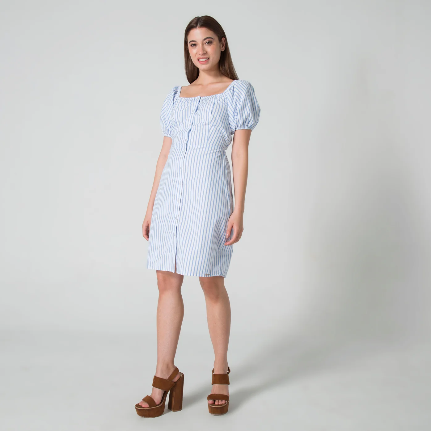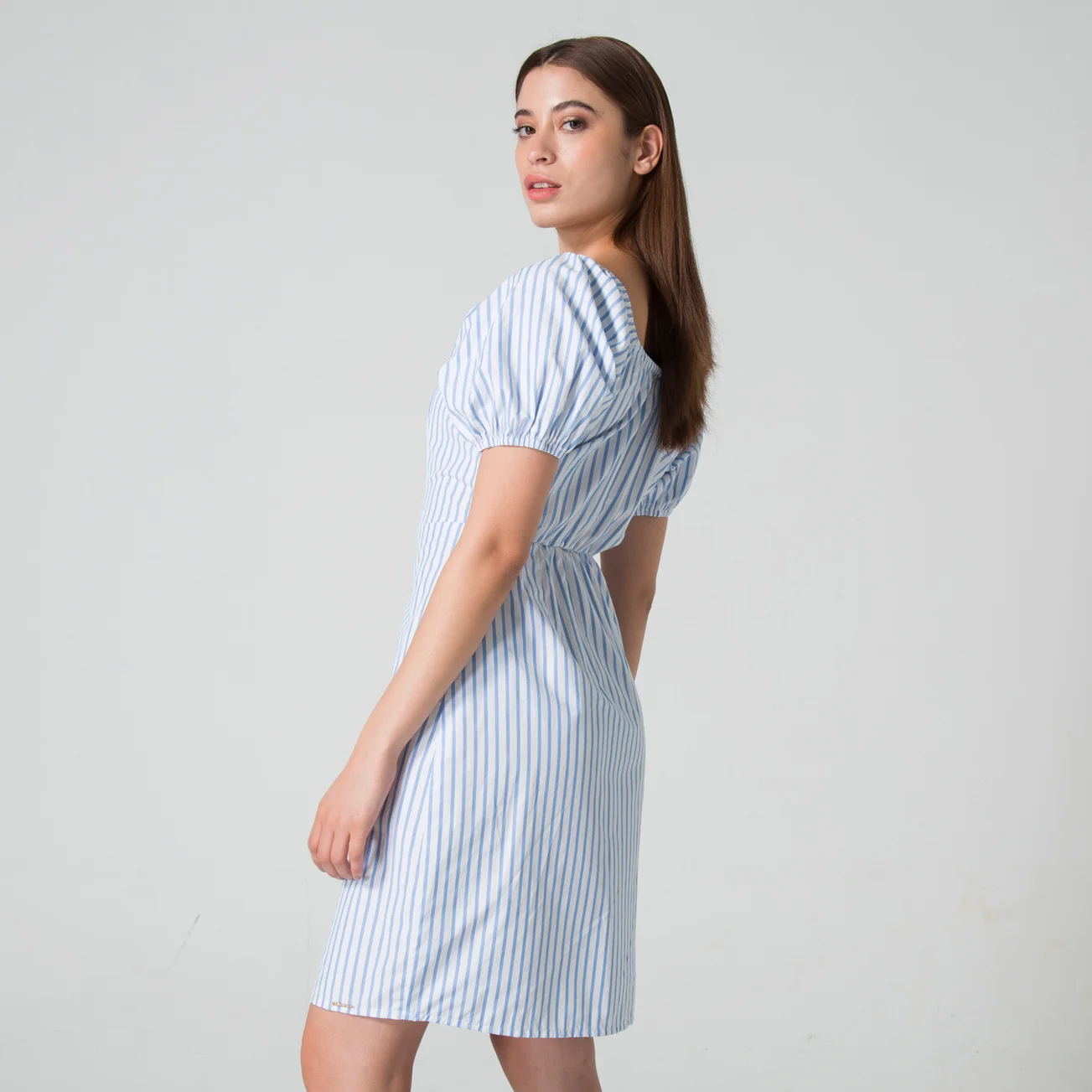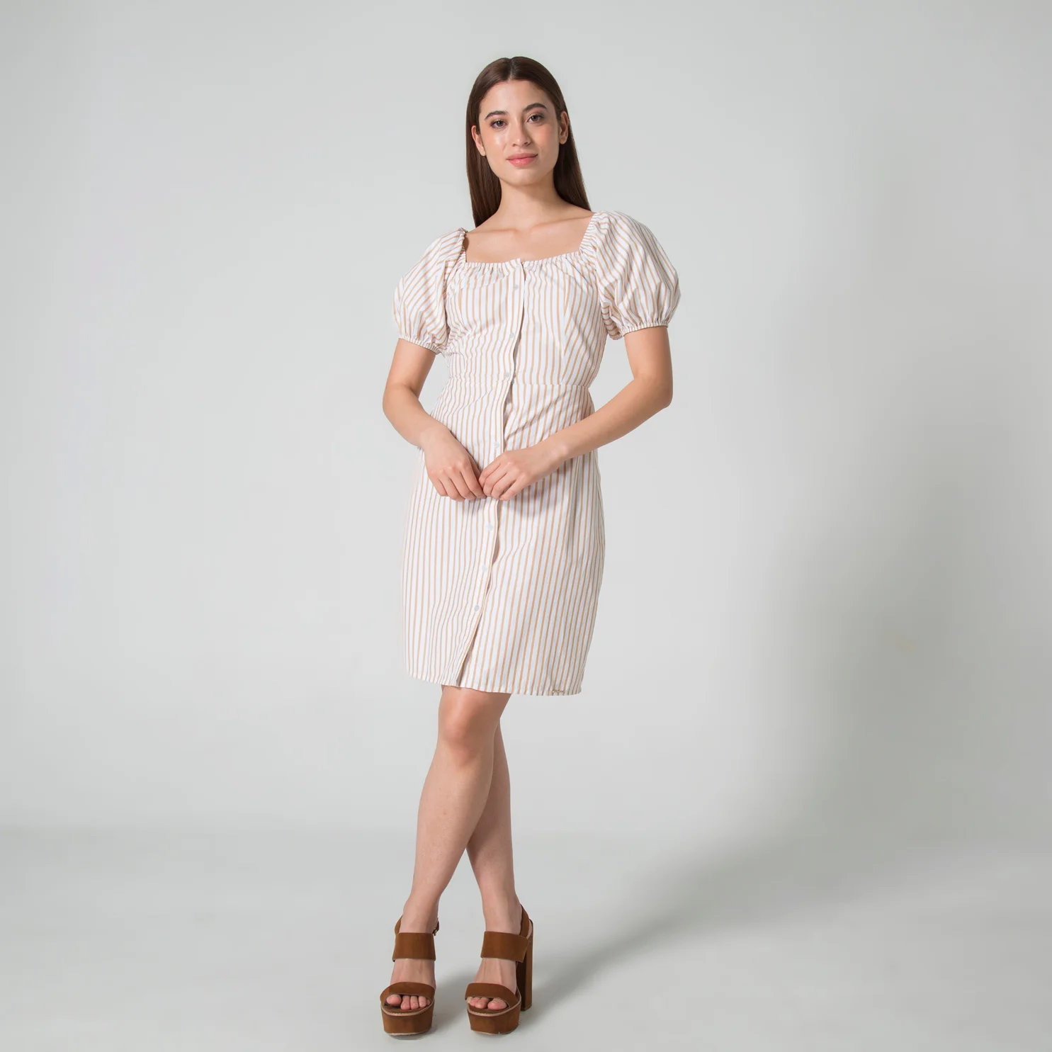 Vestido Genna es una prenda elegante y sofisticada que destaca por su escote bandeja, el cual realza el cuello y proporciona un toque distintivo. Sus mangas globo añaden volumen y un estilo romántico, brindando un contraste atractivo con el ajuste del resto del vestido. El sistema de cierre de botón le da un acabado pulido y funcional, permitiendo un ajuste cómodo y seguro.